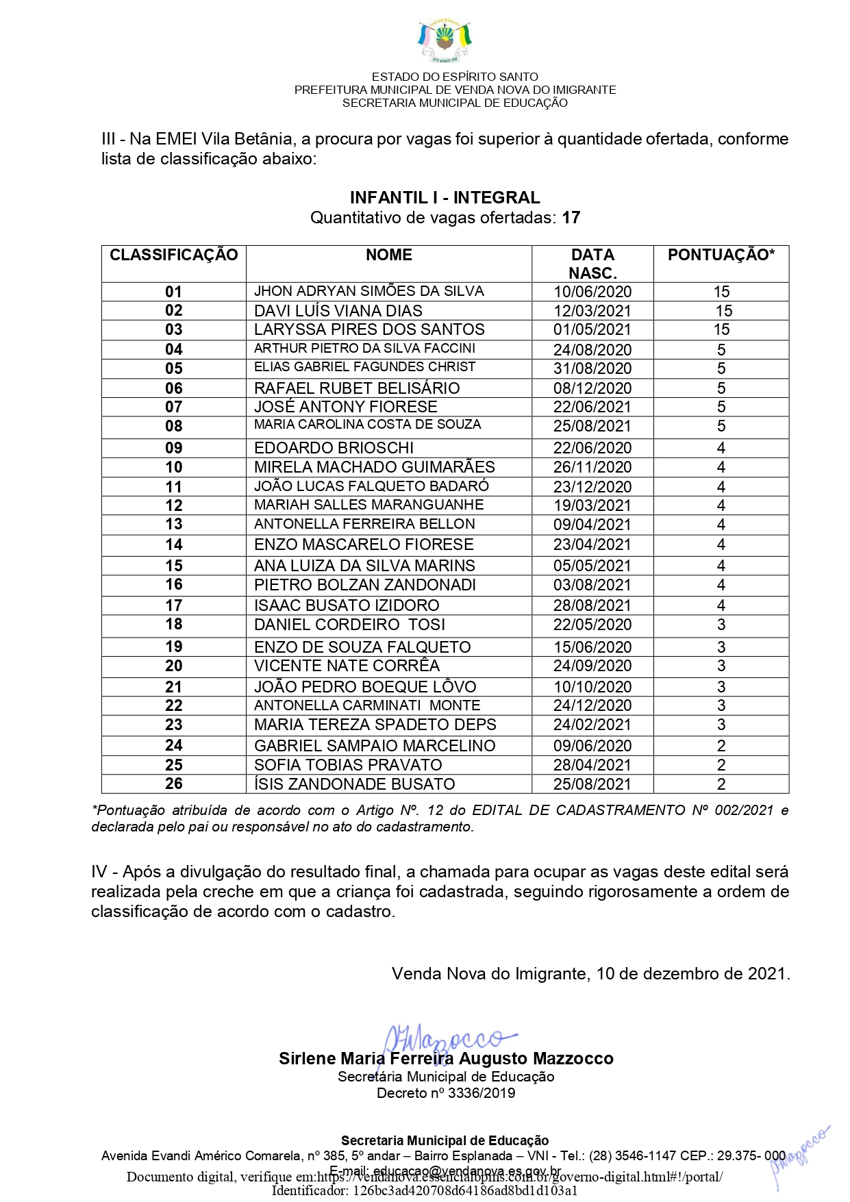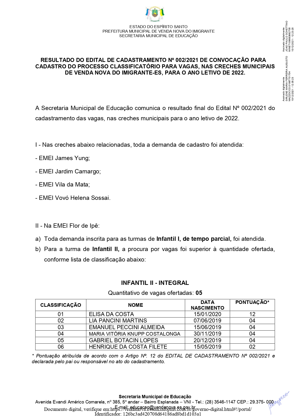 A Prefeitura de Venda Nova do Imigrante, através da Secretaria Municipal de Educação torna público o resultado final do Edital de cadastramento de convocação para cadastro do processo classificatório para vagas nas creches municipais de Venda Nova do Imigrante para o ano letivo de 2022.