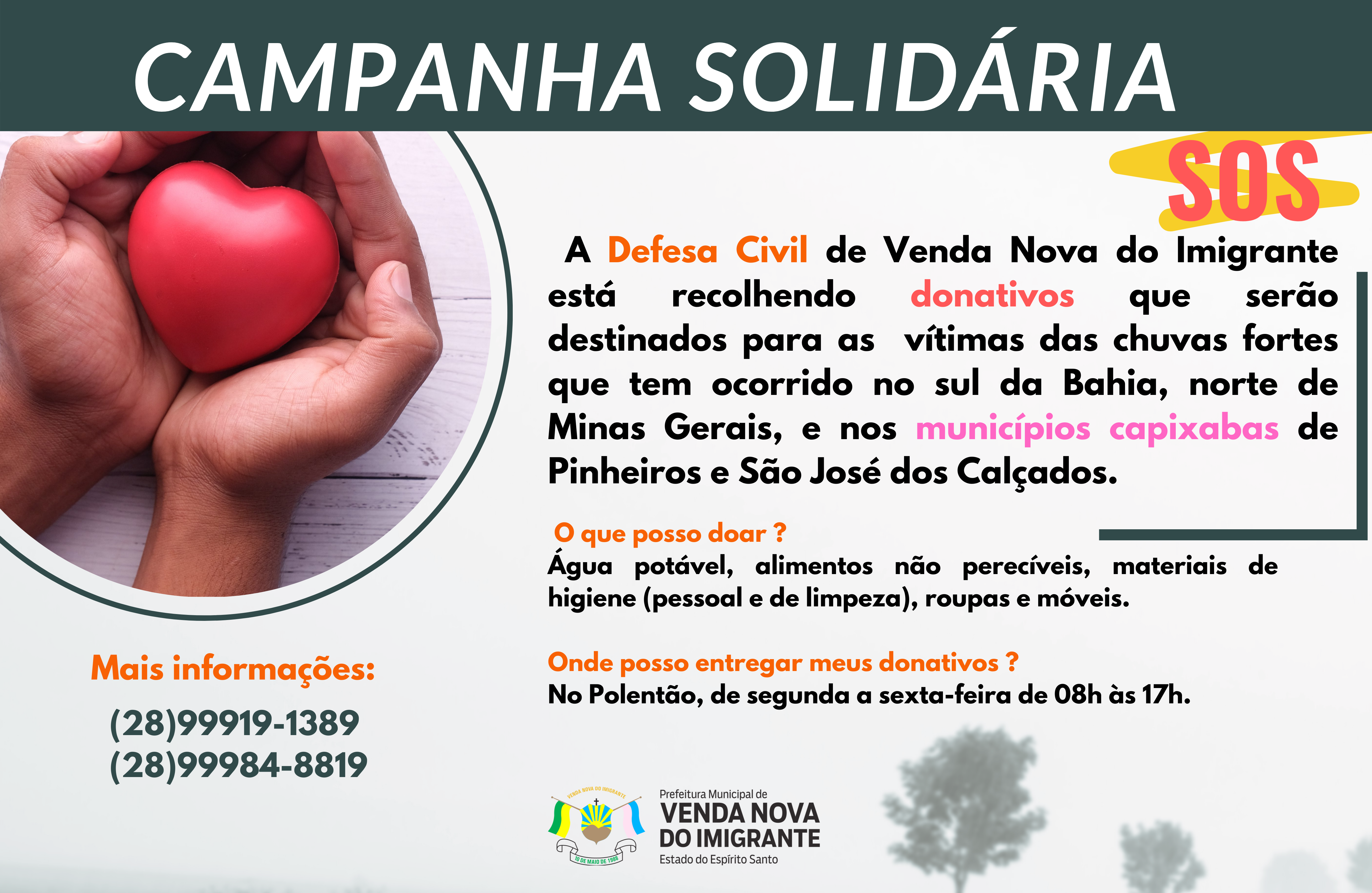 Ação Solidária. A Defesa Civil de Venda Nova do Imigrante está recolhendo donativos que serão destinados para as  vítimas das chuvas fortes que tem ocorrido no sul da Bahia, norte de Minas Gerais, e nos municípios capixabas de Pinheiros e São José dos Calçados. Água potável, alimentos não perecíveis, materiais de higiene (pessoal e de limpeza), roupas e móveis, poderão ser doados no Centro de Eventos Padre Cleto Caliman (Polentão), de segunda a sexta-feira de 08h às 17h.