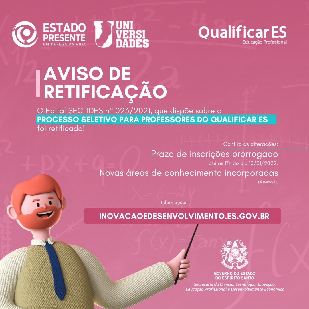 A Secretaria de Inovação e Desenvolvimento (Sectides) abriu processo seletivo para a contratação de professores de Educação Profissional, em regime de designação temporária. Os selecionados vão compor o cadastro de reserva, a ser usado de acordo com a necessidade identificada, em atendimento ao programa Qualificar ES. As inscrições podem ser realizadas, exclusivamente, pela internet, no site www.selecao.es.gov.br.