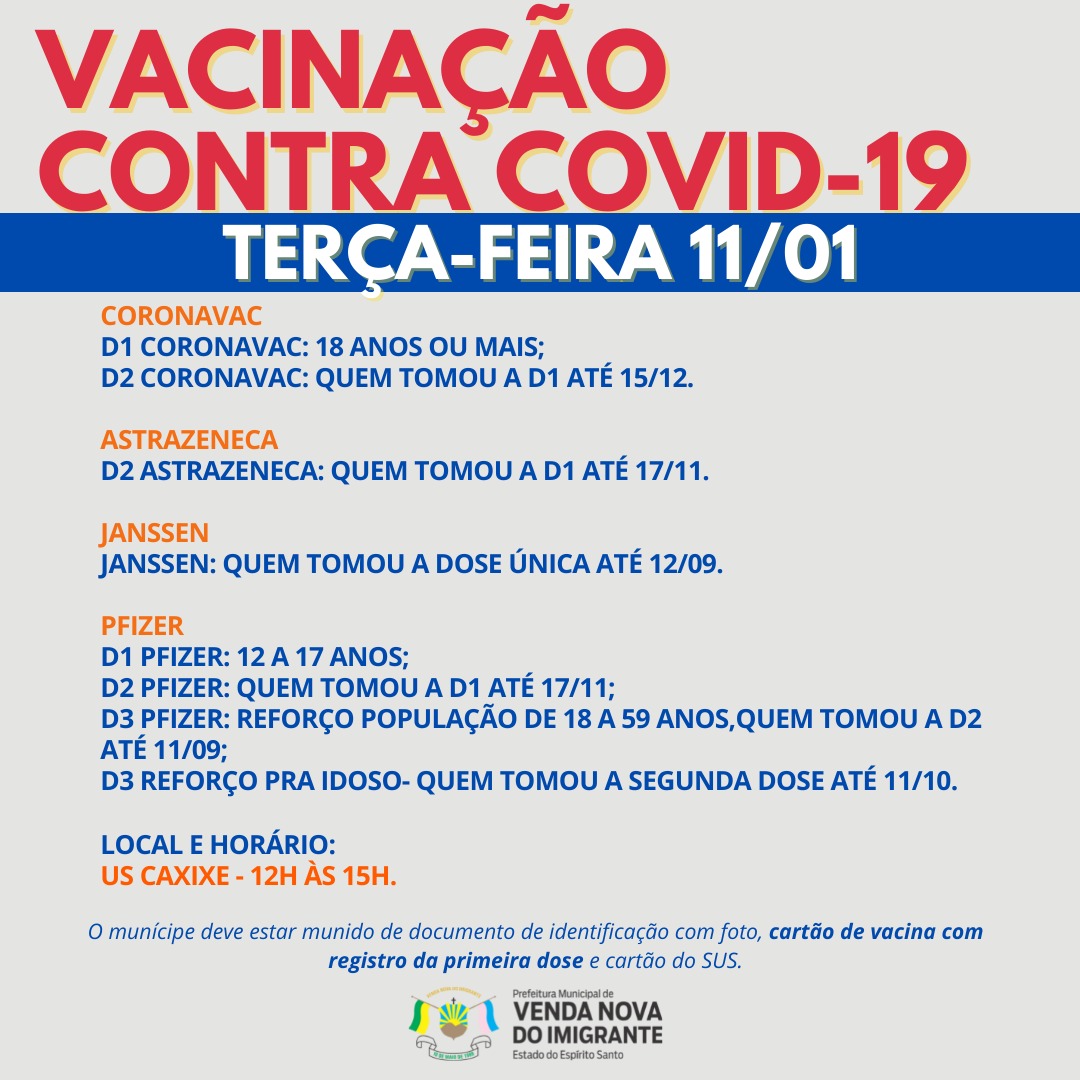 A Prefeitura de Venda Nova do Imigrante, através da Secretaria Municipal de Saúde, continua a campanha de imunização dos munícipes contra a covid-19. Nessa terça-feira(11), serão aplicadas primeira doses para adolescentes de 12 a 17 anos, segunda dose e terceira dose para idosos, trabalhadores da saúde, Pacientes com alto grau de imunossupressão (vide RESOLUÇÃO N° 169/2021 da Comissão Intergestores Bipartite - CIB) e população com idade maior de 18 anos já apta a receber a vacina.