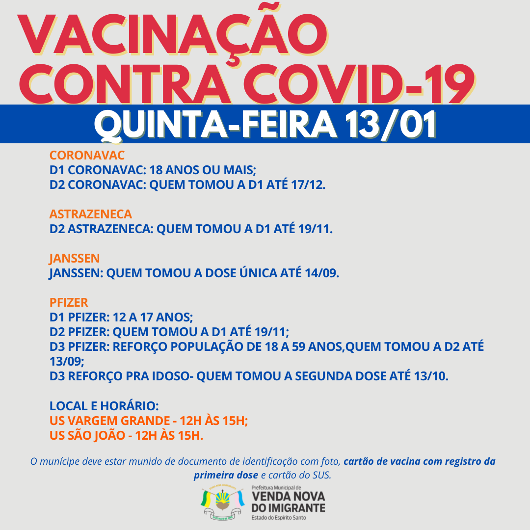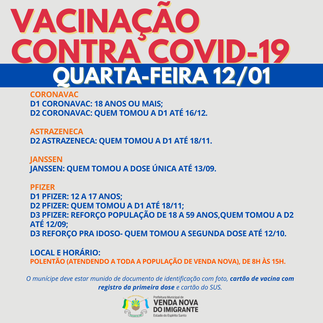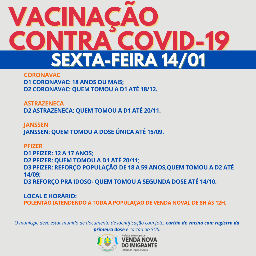 A Prefeitura de Venda Nova do Imigrante, através da Secretaria Municipal de Saúde, continua a campanha de imunização dos munícipes contra a covid-19.  Nessa quarta-feira (12), quinta-feira (13) e sexta-feira (14), serão aplicadas primeira doses para adolescentes de 12 a 17 anos, segunda dose e terceira dose para idosos, trabalhadores da saúde, Pacientes com alto grau de imunossupressão (vide RESOLUÇÃO N° 169/2021 da Comissão Intergestores Bipartite - CIB) e população com idade maior de 18 anos já apta a receber a vacina.