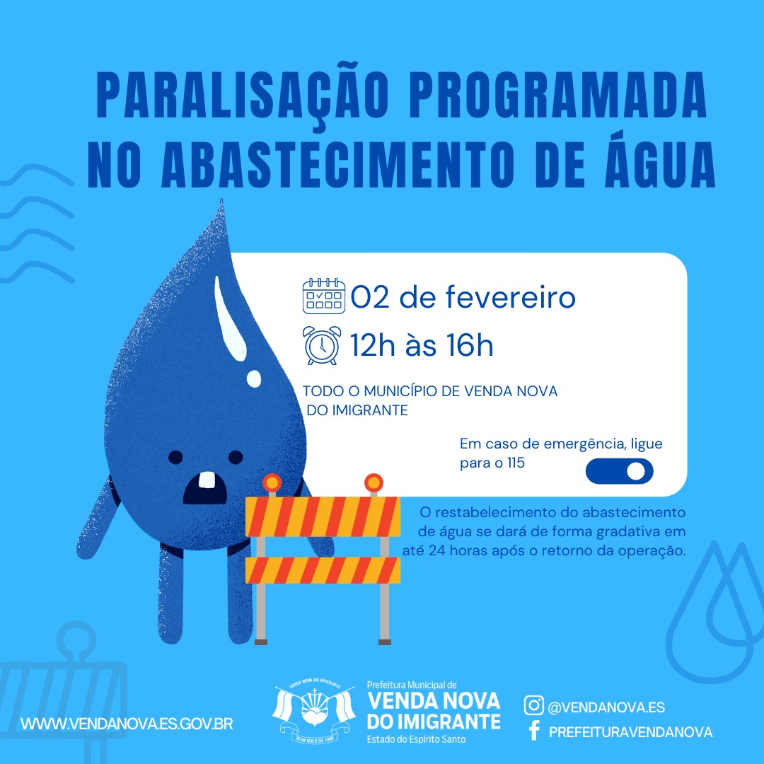 A Prefeitura de Venda Nova do Imigrante informa que nesta quarta-feira (02) haverá uma paralisação programada de abastecimento de água em todo o Município de Venda Nova do Imigrante de 12h às 16h para manutenção na rede de abastecimento.