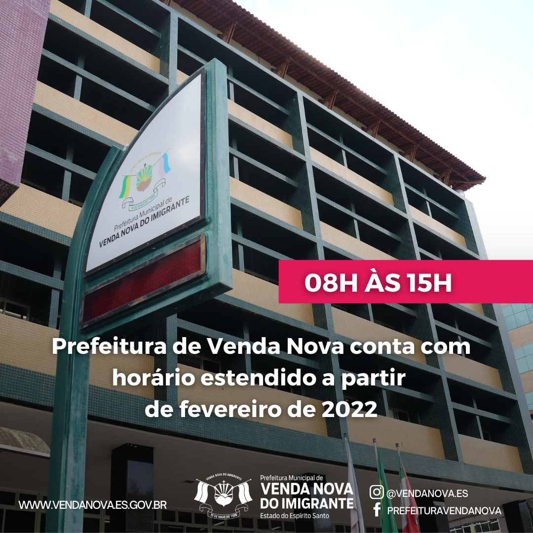 O cidadão que deseja ser atendido na Prefeitura de Venda Nova não precisa mais esperar até 12h. De modo a melhor atender a população vendanovense, a Prefeitura de Venda Nova do Imigrante atenderá em horário estendido, pela manhã e também a tarde a partir de fevereiro de 2022: de 08h às 15h.