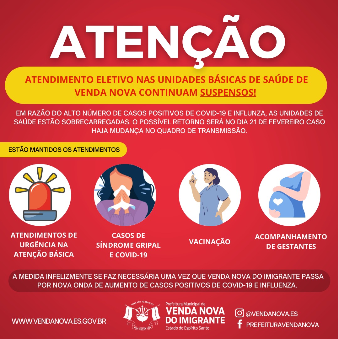 Em virtude do aumento de casos de pessoas com sintomas respiratórios e alta confirmação de casos positivos de Covid-19 em Venda Nova do Imigrante, a Prefeitura de Venda Nova, através da Secretaria Municipal de Saúde suspendeu os atendimentos eletivos nas Unidades Básicas de Saúde do Município no último dia (24), a medida foi tomada por causa do alto número de casos positivos de covid-19 e influenza no Município, o que sobrecarregou  as unidades de saúde.
