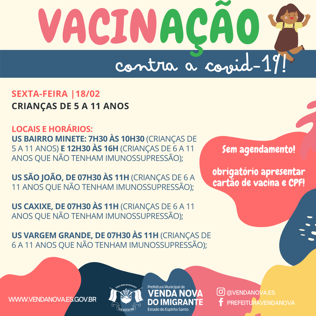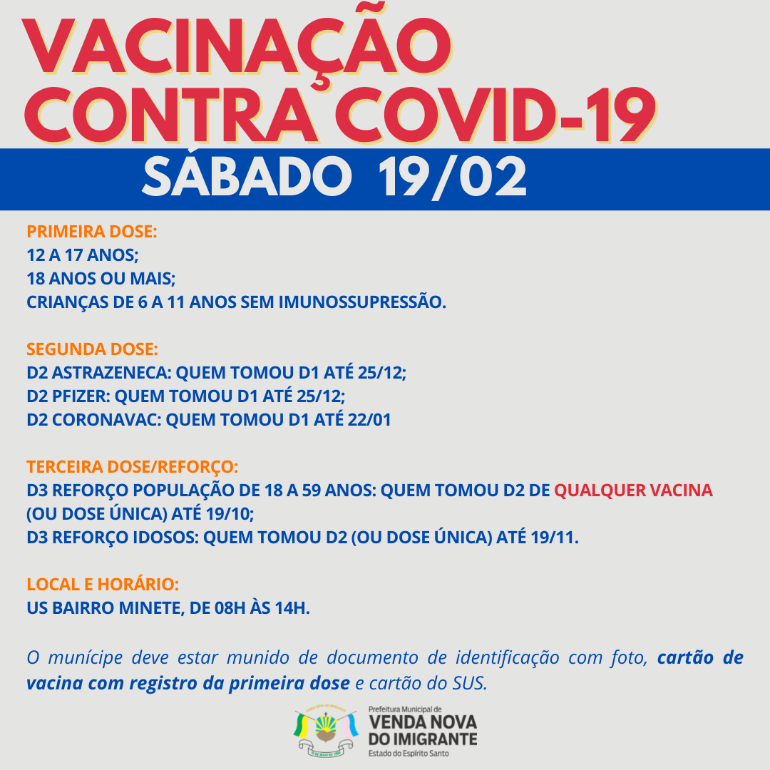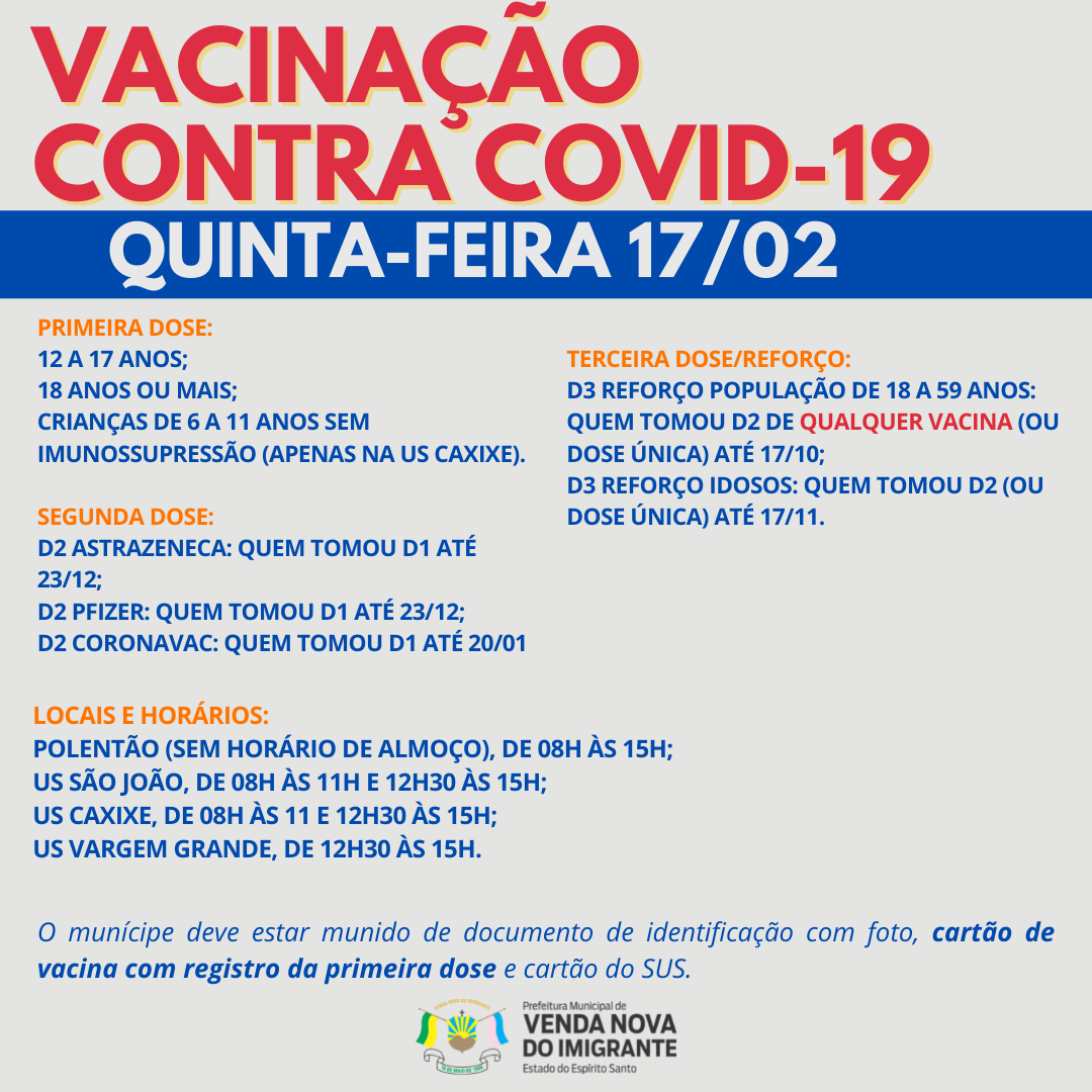 A Prefeitura de Venda Nova do Imigrante, através da Secretaria Municipal de Saúde, continua a campanha de imunização dos munícipes contra a covid-19. Confira as datas, horários e público abaixo.