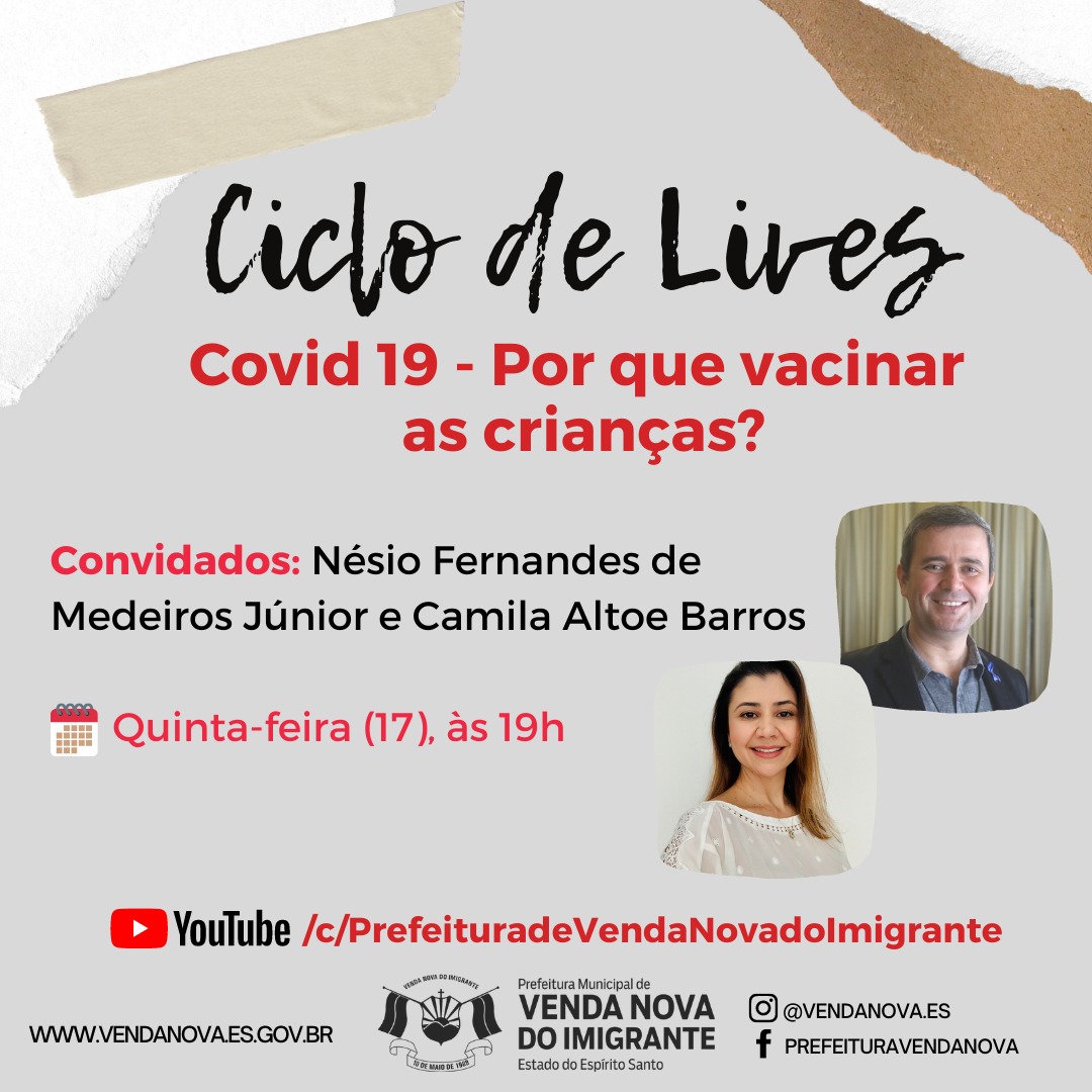 A vacinação infantil contra a Covid-19 é um assunto que ainda deixa muitos pais em dúvida. Na próxima quinta-feira (17), com o propósito de sanar as dúvidas a respeito da segurança da aplicação da vacina com respaldo científico, a Prefeitura de Venda Nova do Imigrante, através das Secretarias Municipais de Saúde e Educação, em parceria com a Sesa, realizarão mais um encontro do Ciclo de Lives da Educação com tema: Covid 19 – Por que vacinar as crianças?