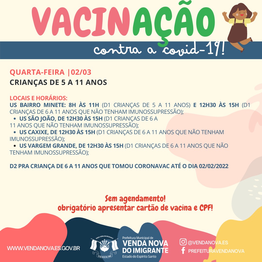 A Prefeitura de Venda Nova do Imigrante, através da Secretaria Municipal de Saúde, dá continuidade a vacinação da população contra Covid-19. Nessa quarta-feira (23) e na próxima quarta (02/03), nas Unidades de Saúde do Município, crianças de 5 a 11 anos com ou sem imunossupressão poderão receber a primeira e segunda dose da vacina.