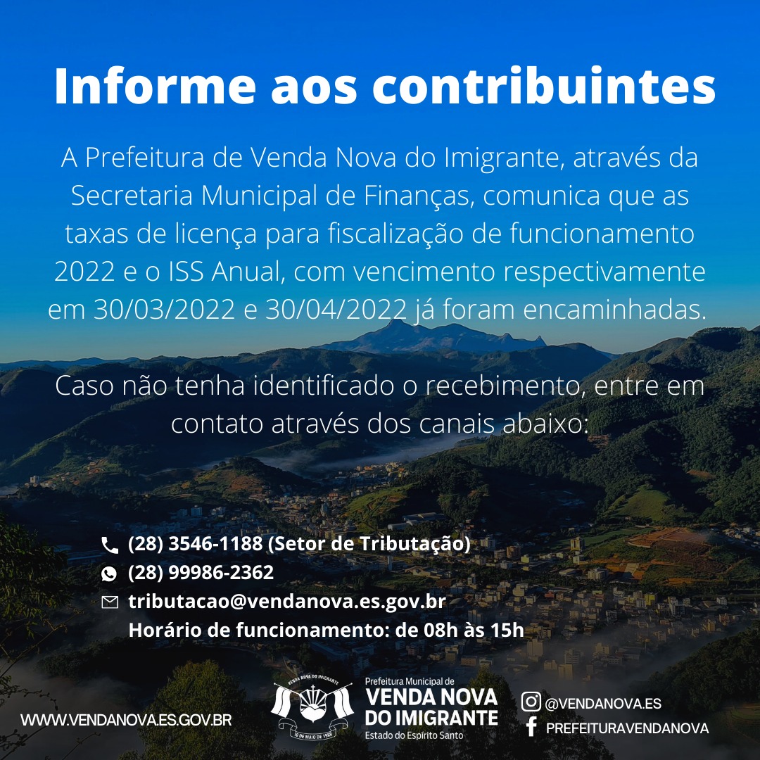 A Prefeitura de Venda Nova do Imigrante, através da Secretaria Municipal de Finanças, comunica que as taxas de licença para fiscalização de funcionamento 2022 e o ISS Anual, com vencimento respectivamente em 30/03/2022 e 30/04/2022 já foram encaminhadas.