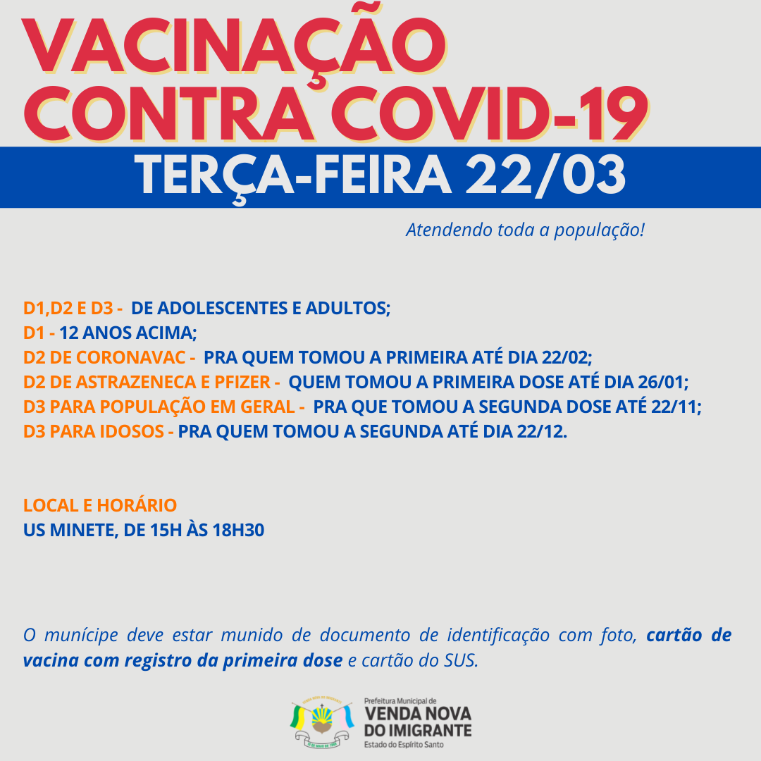 A Prefeitura de Venda Nova do Imigrante, através da Secretaria Municipal de Saúde, continua a campanha de imunização dos munícipes contra a covid-19. Nesta terça-feira (22) estão sendo aplicadas todas as doses do imunizante.