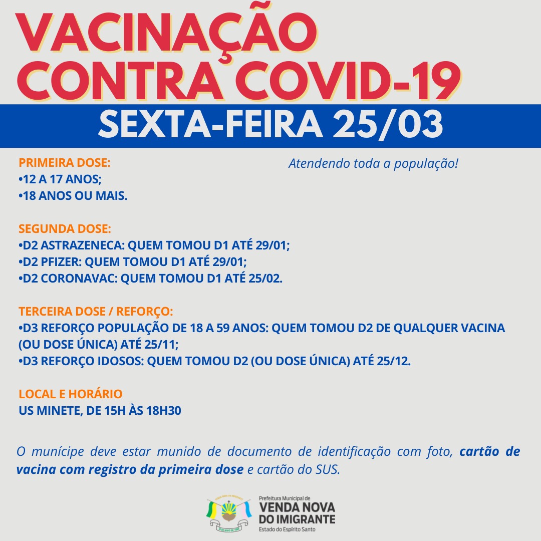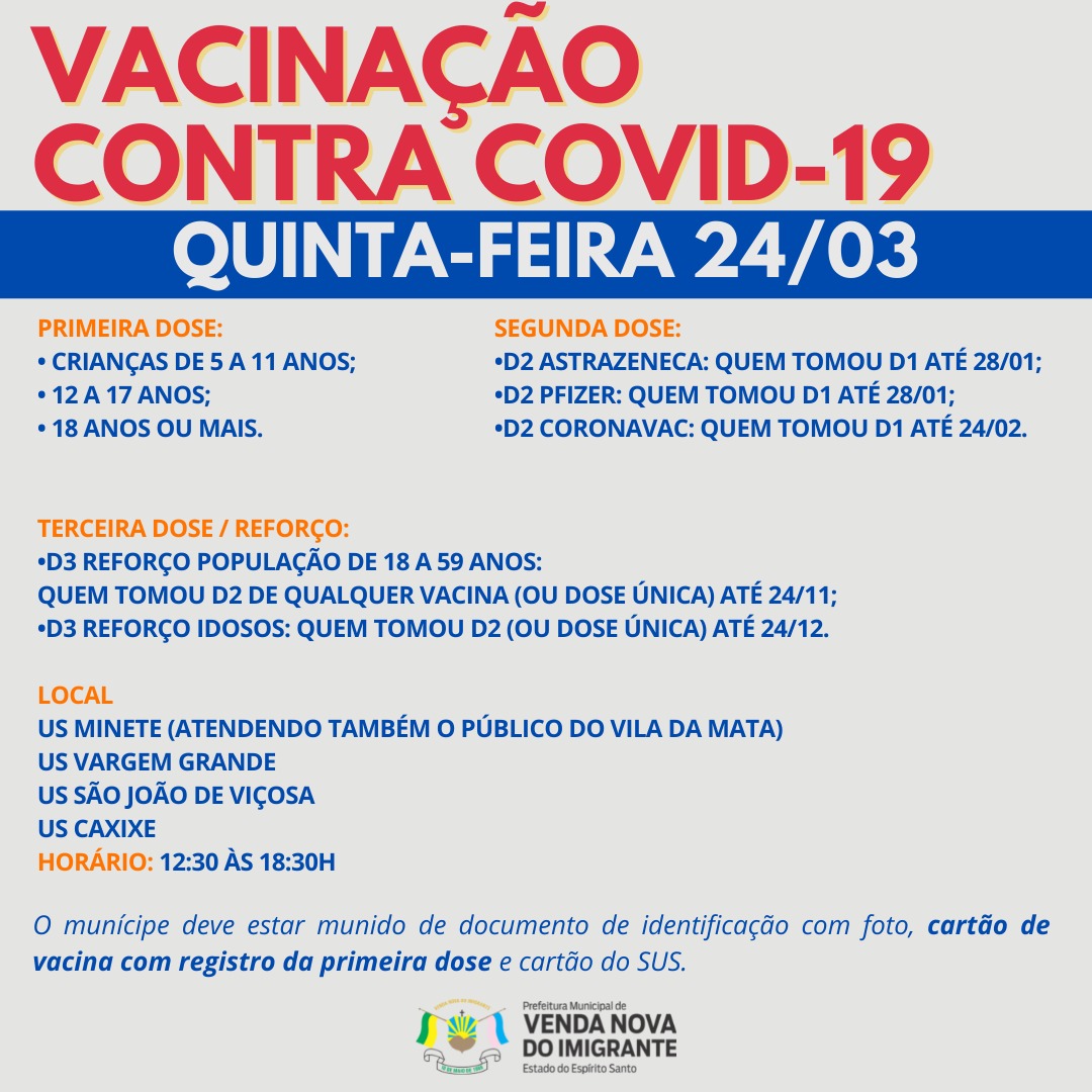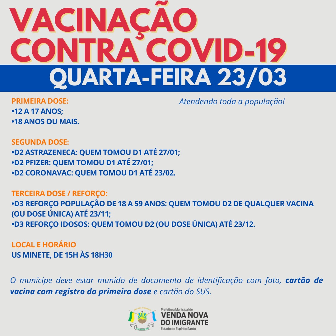 A Prefeitura de Venda Nova do Imigrante, através da Secretaria Municipal de Saúde, continua a campanha de imunização dos munícipes contra a covid-19. Nessa quarta-feira (23), quinta-feira (24) e sexta-feira (25), serão aplicadas todas as doses do imunizante para a população com mais de 12 anos de idade.