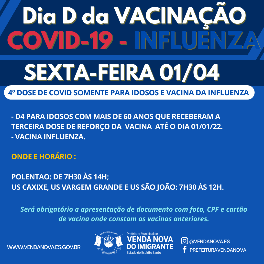 A Prefeitura de Venda Nova do Imigrante, através da Secretaria Municipal de Saúde, dá continuidade a vacinação contra o Covid-19 e vírus Influenza no Município. Na próxima sexta-feira (01/04), nas Unidades de Saúde do Caxixe, Vargem Grande, São João e excepcionalmente no Centro de Eventos Padre Cleto Caliman (Polentão), acontece o Dia D da Campanha de vacina da Influenza e o início da aplicação da 4º dose de Covid-19, que nesse momento atenderá somente idosos com mais de 60 anos.