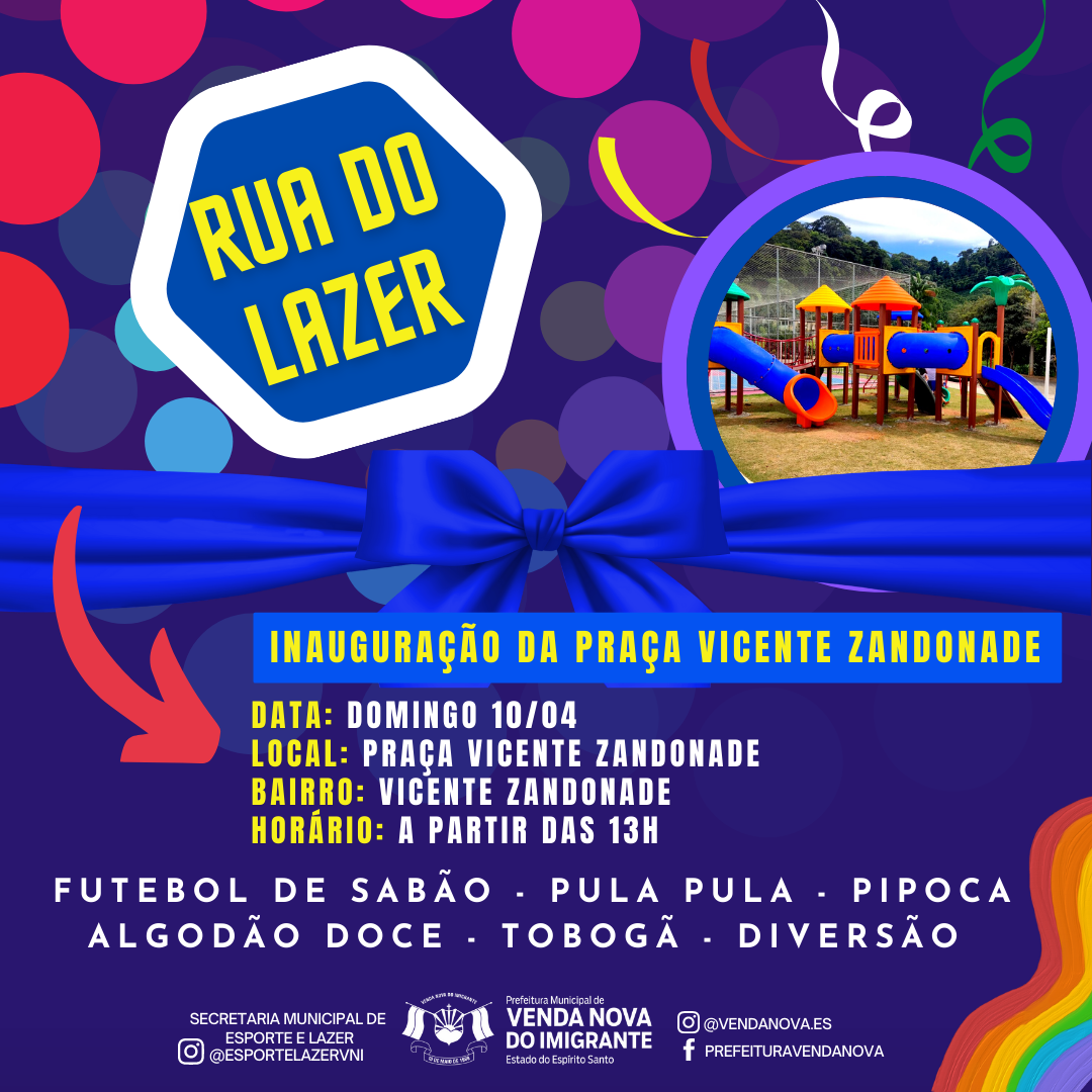Acontece no Próximo domingo (10), a partir das 13h, a inauguração e entrega da praça Vicente Zandonade, que fica na Vila Betanea. Além das melhorias realizadas pela Prefeitura anteriormente, como parquinho com escorregador, túnel, escalada, castelinhos, entre outros, nesse dia, a criançada terá a diversão garantida com muita pipoca, futebol de sabão, pula-pula, algodão doce e tobogã. Traga sua família e participe!