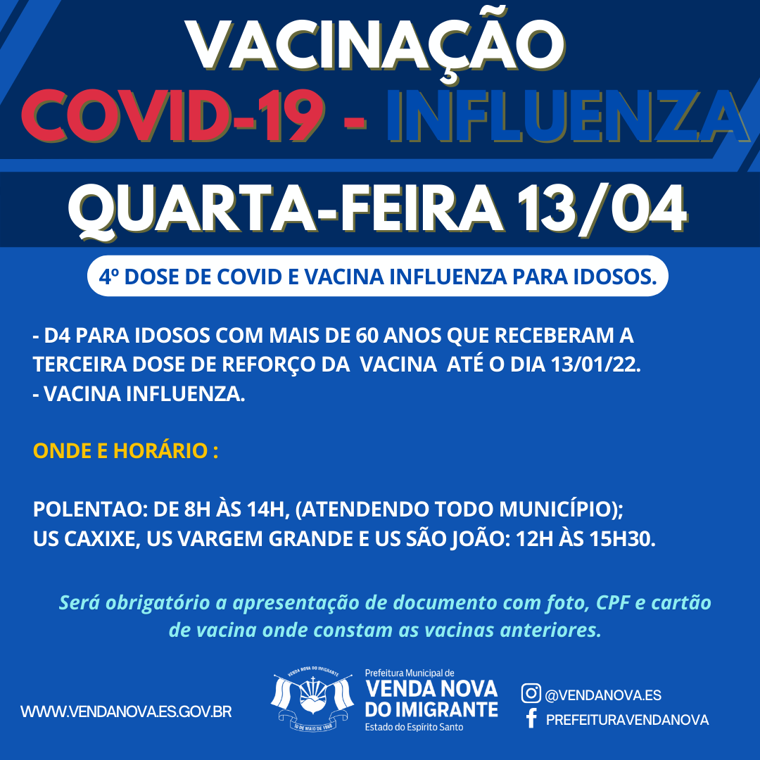 A Prefeitura de Venda Nova do Imigrante, através da Secretaria Municipal de Saúde, dá continuidade a vacinação contra o Covid-19 e vírus Influenza no Município. Na próxima quarta-feira (06/04), nas Unidades de Saúde do Caxixe, Vargem Grande, São João e excepcionalmente no Centro de Eventos Padre Cleto Caliman (Polentão), acontece a Campanha de vacina da Influenza e aplicação da 4º dose de Covid-19, que nesse momento atenderá somente idosos com mais de 60 anos.