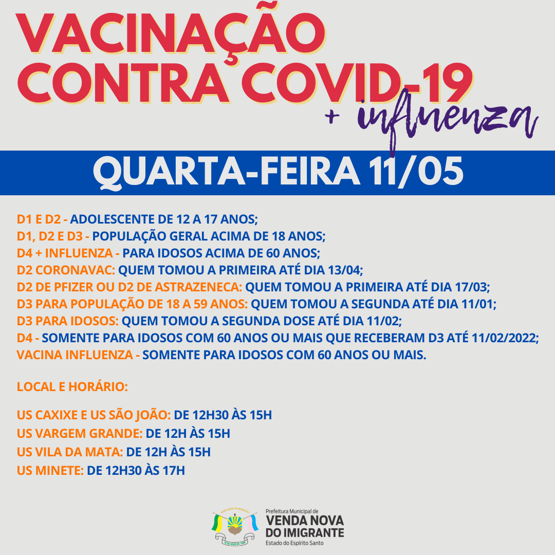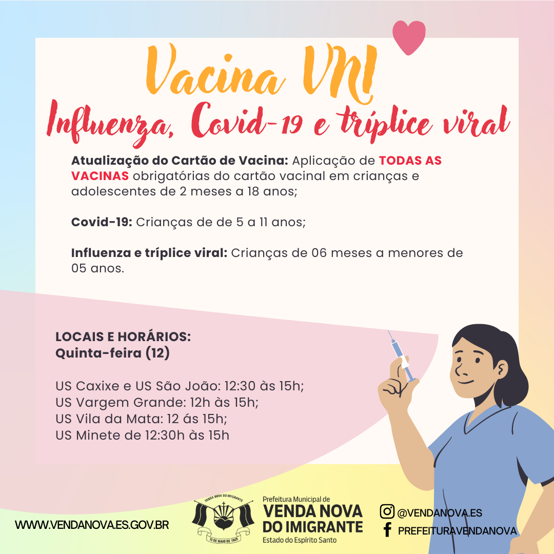 A Prefeitura de Venda Nova do Imigrante, através da secretaria municipal de Saúde, continua a imunização dos munícipes. Nesta quarta (11) e quinta-feira (12), serão aplicadas doses de vacina contra Covid-19 para todos os públicos, será realizada a atualização do cartão de vacina com a aplicação de todas as vacinas obrigatórias do cartão vacinal em crianças e adolescentes de 2 meses a 18 anos, além de vacinação contra influenza e tríplice viral. Confira: