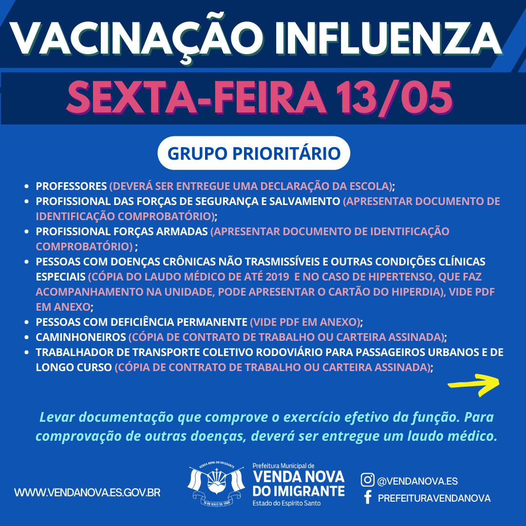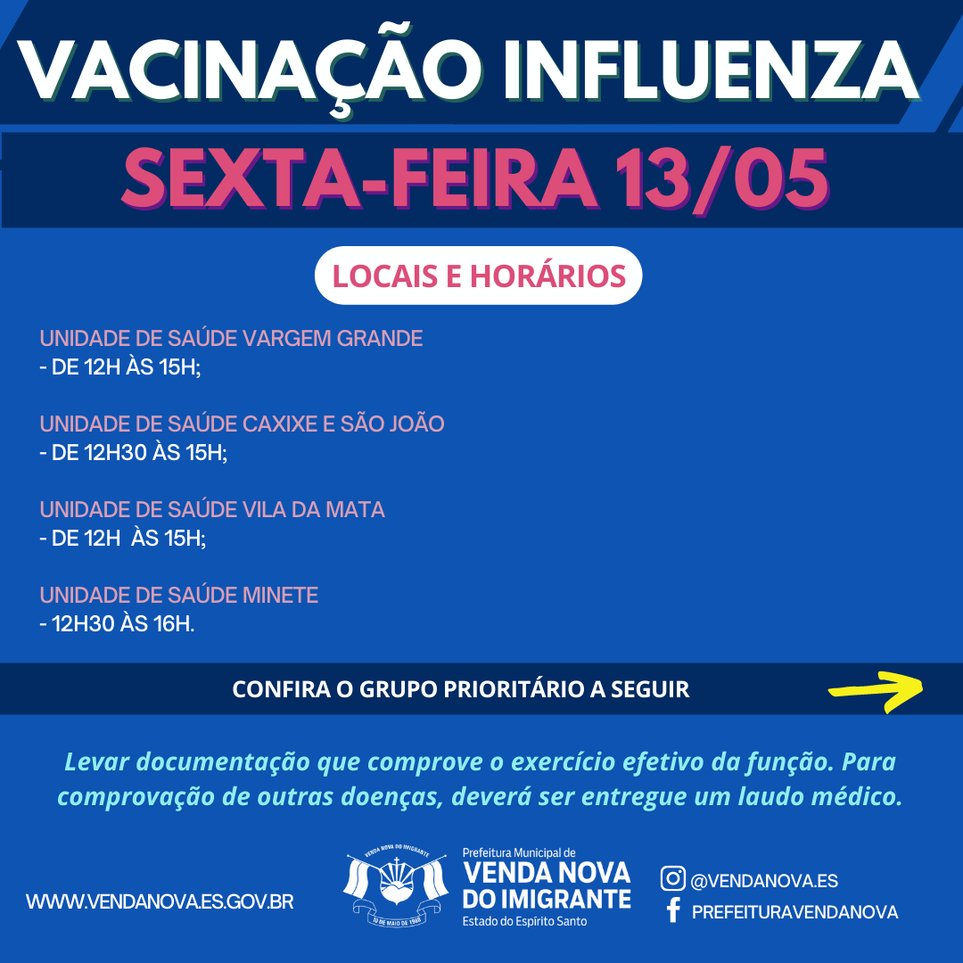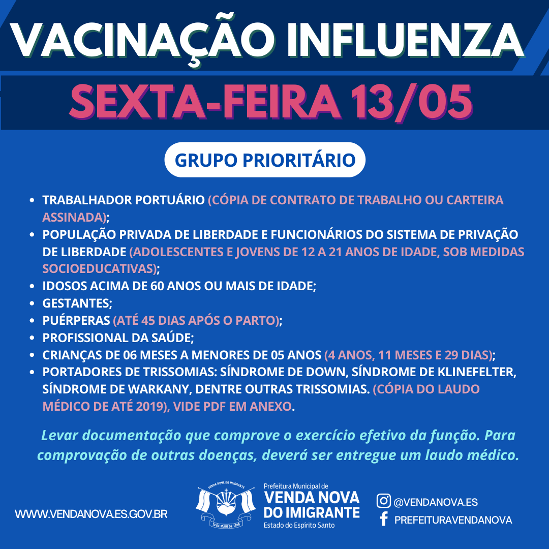 A Prefeitura de Venda Nova do Imigrante continua a imunização dos munícipes contra o vírus da Influenza/gripe. Nessa sexta-feira (13), mais pessoas dos grupos prioritários (de acordo com a Sesa), poderão receber a vacina mediante a apresentação de comprovantes. Confira: