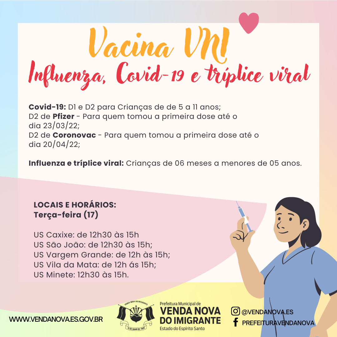 A Prefeitura de Venda Nova do Imigrante continua com a imunização dos munícipes. Nesta terça-feira, haverá em todas as Unidades de Saúde do Município vacinação contra covid-19, o virús da influenza e tríplice viral. Confira abaixo o horário de vacinação em cada Unidade de Saúde.