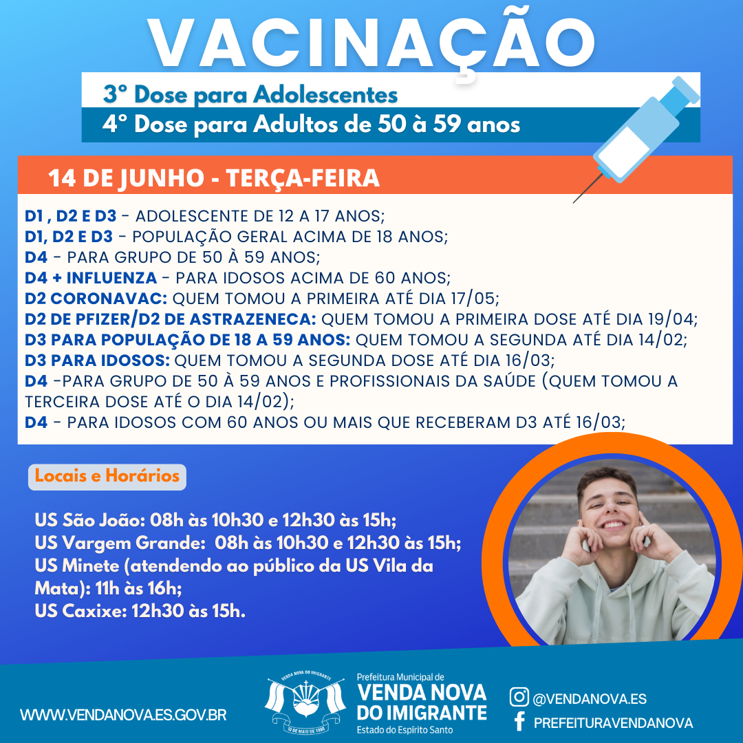 A Prefeitura de Venda Nova do Imigrante continua a imunização dos munícipes contra o vírus da Covid-19. Nesta terça-feira (14), haverá distribuição da 3º dose da vacina para adolescentes de 12 a 17 anos e 4º dose do imunizante para adultos com idade entre 50 à 59 anos.