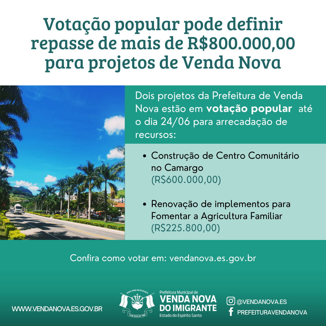 A Prefeitura de Venda Nova do Imigrante, através das secretarias municipais de Assistência Social e Agricultura, teve dois projetos aprovados no edital de emendas parlamentares do Deputado Federal Felipe Rigoni. Os projetos de renovação de implementos para fomentar a agricultura familiar em Venda Nova, e a construção de um Centro Comunitário no Camargo estão em votação popular até o dia 24 de junho para receber recursos de R$225.800,00 e R$600.000,00 respectivamente. Sua participação é importante, vote e compartilhe!