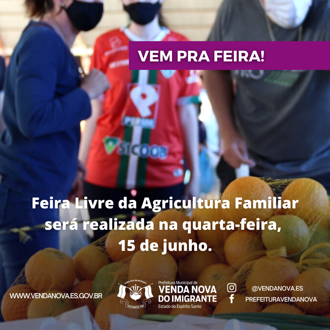 A Prefeitura de Venda Nova do Imigrante, através da Secretaria Municipal de Agricultura, informa que por conta do feriado de Corpus Christi, comemorado na quinta-feira(16), a Feira livre da agricultura familiar será realizada na quarta-feira, 15 de junho.