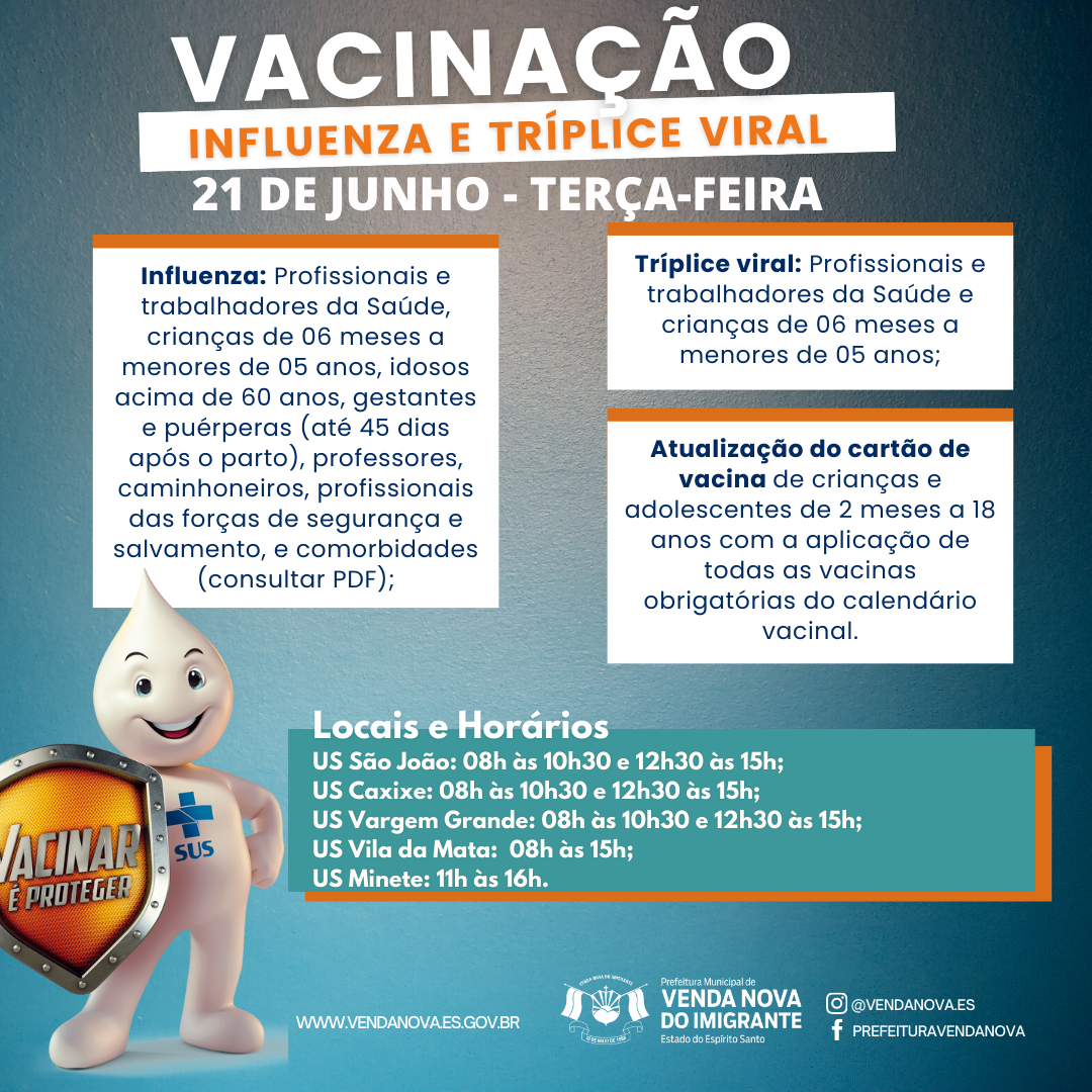 A Prefeitura de Venda Nova do Imigrante, através da secretaria municipal de Saúde, continua a imunização dos munícipes. Na próxima terça-feira (21), serão aplicadas as doses contra Influenza em crianças de 06 meses a menores de 05 anos, idosos e para grupos prioritários definidos pela Secretaria de Saúde (SESA). Confira:
