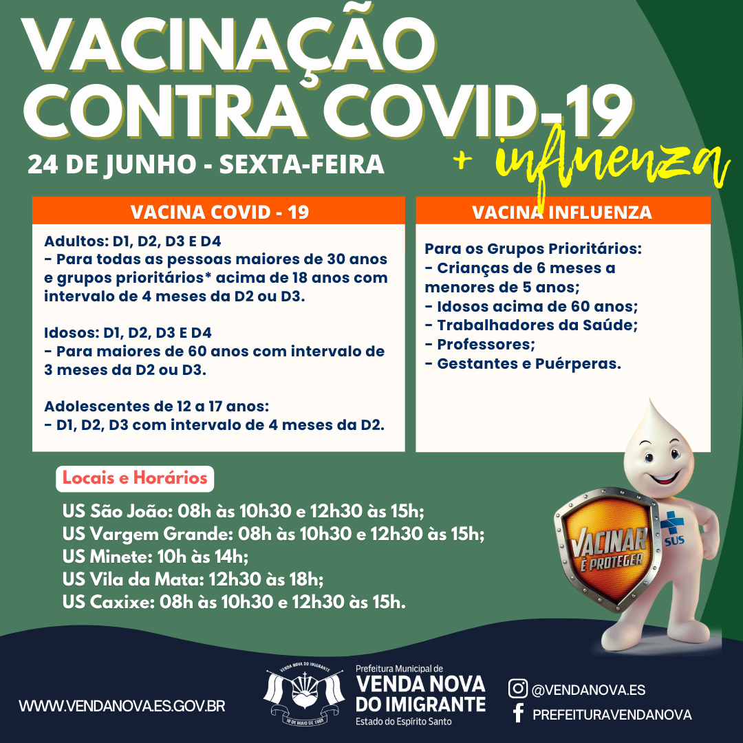 A Prefeitura de Venda Nova do Imigrante, intensifica a imunização dos munícipes contra o vírus da Covid-19. Nesta sexta-feira (24), haverá distribuição de todas as doses da vacina, além da 4º dose da vacina para pessoas com mais de 30 anos de idade e Profissionais da saúde.