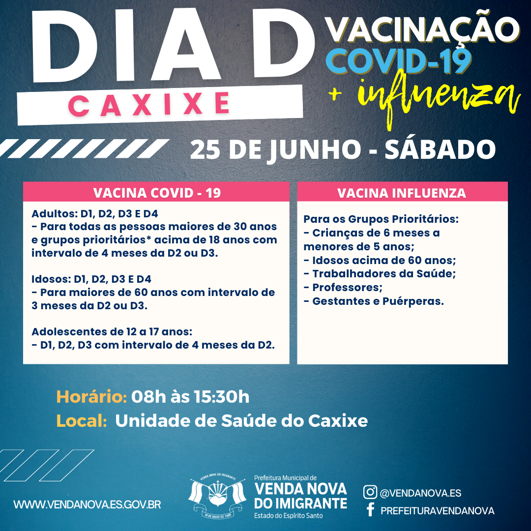 A Prefeitura de Venda Nova do Imigrante, através da Secretaria Municipal de Saúde, intensifica a vacinação contra o Covid-19 e vírus Influenza no Município. Neste sábado (25), na Unidade de Saúde do Caxixe, acontece o Dia D da Campanha de vacina contra o Covid-19 e o vírus Influenza. A Campanha, que já vem distribuindo a 4º dose da Vacina contra o Covid-19 para pessoas acima de 30 anos, também contemplará os grupos prioritários de ambas vacinas, tanto Covid quanto Influenza.