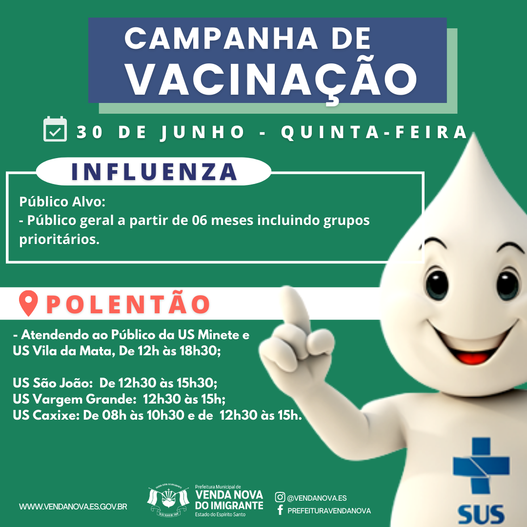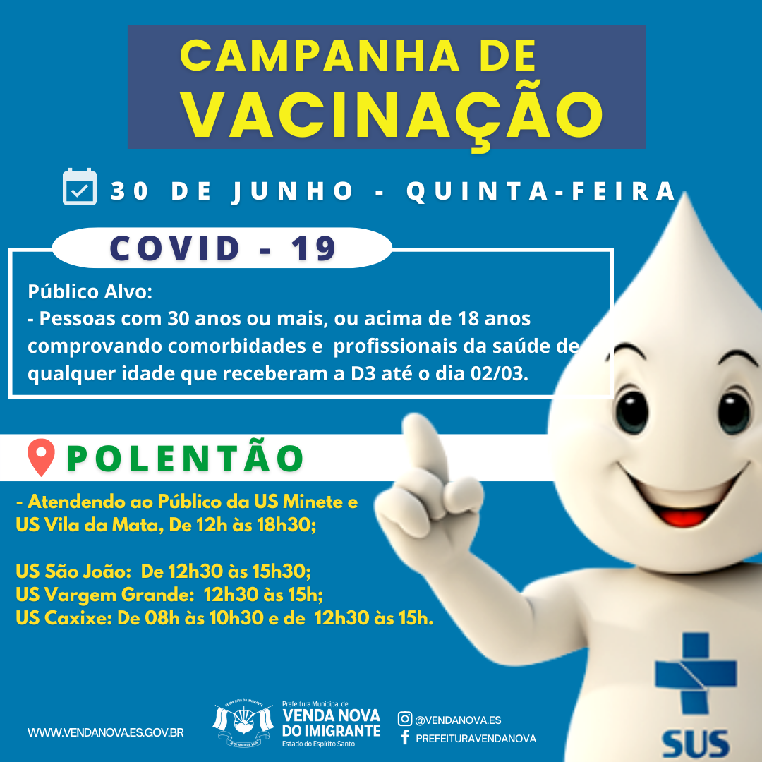 A Prefeitura de Venda Nova do Imigrante, intensifica a imunização dos munícipes contra o vírus da Covid-19. Nesta quinta-feira (30), haverá distribuição de todas as doses da vacina, além da 4º dose da vacina para pessoas com mais de 30 anos de idade e Profissionais da saúde. Na oportunidade ainda, a Campanha também disponibilizará a Vacina contra o Vírus Influenza para o grupo prioritário.