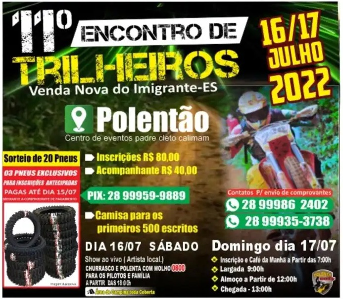 A Associação Polenta Trail Club, em parceria com a Prefeitura de Venda Nova do Imigrante, irá realizar neste final de semana no Centro de Eventos Padre Cleto Caliman (Polentão), o 11º Encontro de Trilheiros de Venda Nova do Imigrante. O evento beneficente acontece anualmente e parte do lucro será doado para a Apae VNI. As inscrições estão sendo realizadas via pix com envio de comprovante. Os valores são: 80 reais para pilotos, e 40 reais para acompanhantes. Os primeiros 500 inscritos receberão camisa do evento.