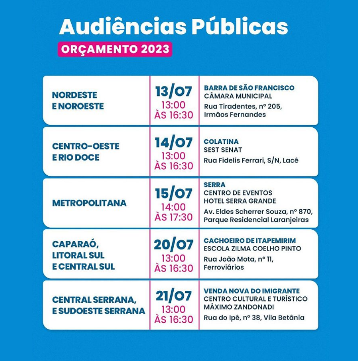 O Governo do Estado irá realizar na próxima quinta-feira (21), às 13h, no Centro Cultural e Turístico Máximo Zandonadi, audiência pública para o Orçamento 2023. A audiência é um momento onde os cidadãos poderão obter informações e apresentar sugestões para a elaboração da peça orçamentária, dialogando com secretários, subsecretários e dirigentes de órgãos das nove áreas estratégicas do Governo: Segurança em Defesa da Vida, Saúde Integral, Educação para o Futuro, Desenvolvimento Social e Direitos Humanos, Infraestrutura para Crescer, Gestão Pública Inovadora, Agricultura e Meio Ambiente, Desenvolvimento Econômico, Cultura, Turismo, Esporte e Lazer.