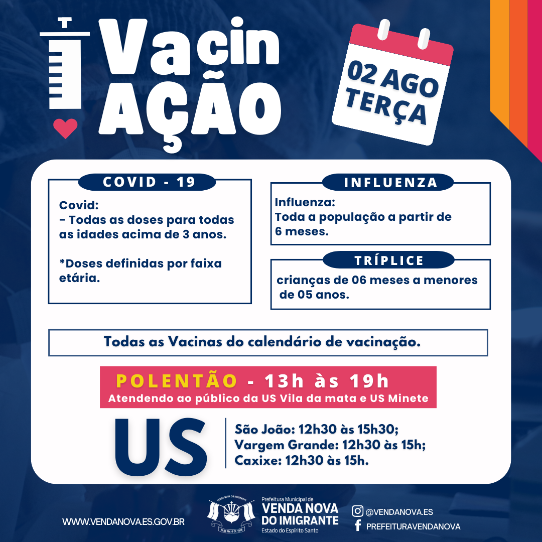 A Prefeitura de Venda Nova do Imigrante, através da Secretaria Municipal de Saúde, intensifica a vacinação no Município. Nesta terça-feira (02), será realizada no Centro de Eventos Padre Cleto Caliman (Polentão) e em unidades de saúde do Município a campanha de vacinação com a aplicação de todas as doses previstas no cartão de vacina para todas as idades a partir de 3 anos.