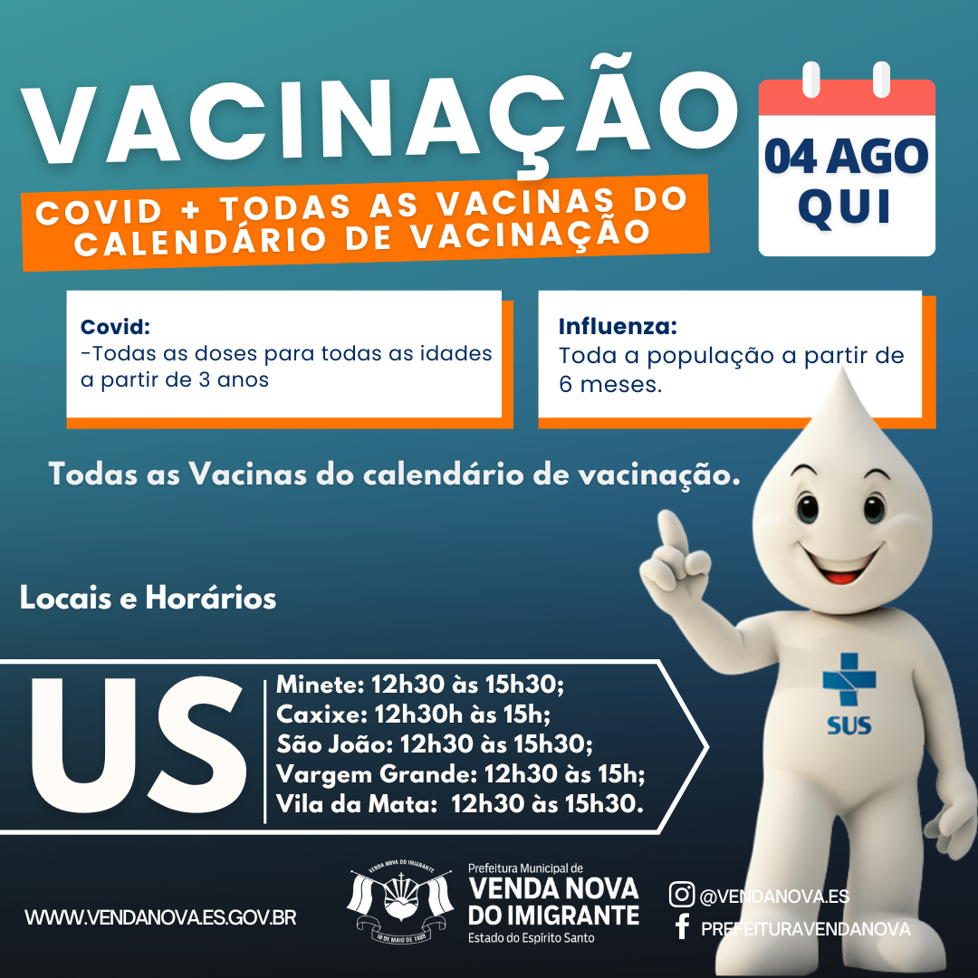 A Prefeitura de Venda Nova do Imigrante, através da Secretaria Municipal de Saúde, intensifica a vacinação no Município. Nesta quinta-feira (04), será realizada nas Unidades de Saúde do Município a campanha de vacinação com a aplicação de todas as doses previstas no cartão de vacina para todas as idades a partir de 3 anos.