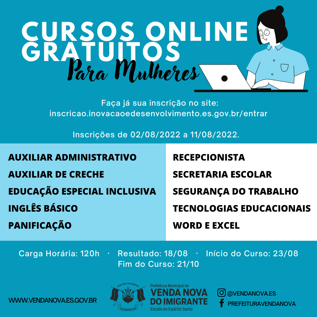 Mais uma oportunidade de qualificação gratuita em Venda Nova do Imigrante. Estão abertas as inscrições para a segunda oferta de cursos gratuitos online do “QualificarES Mulher” no Município. As inscrições irão até o dia 11 de agosto no site do programa. A idade mínima é de 16 anos. Realize sua inscrição aqui.