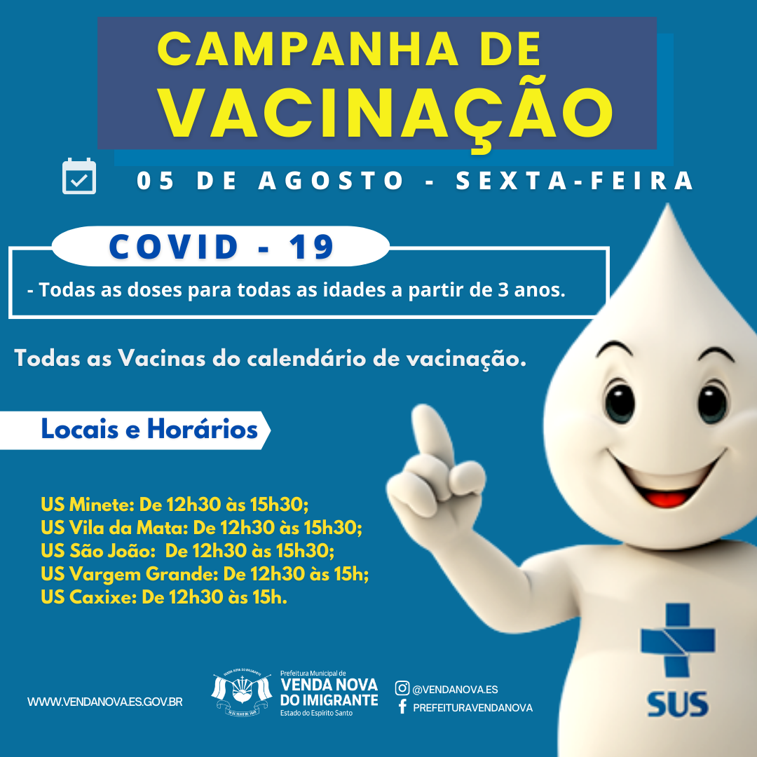 A Prefeitura de Venda Nova do Imigrante, através da Secretaria Municipal de Saúde, intensifica a vacinação no Município. Nesta sexta-feira (05), será realizada nas Unidades de Saúde do Município a campanha de vacinação com a aplicação de todas as doses previstas no cartão de vacina para todas as idades a partir de 3 anos.