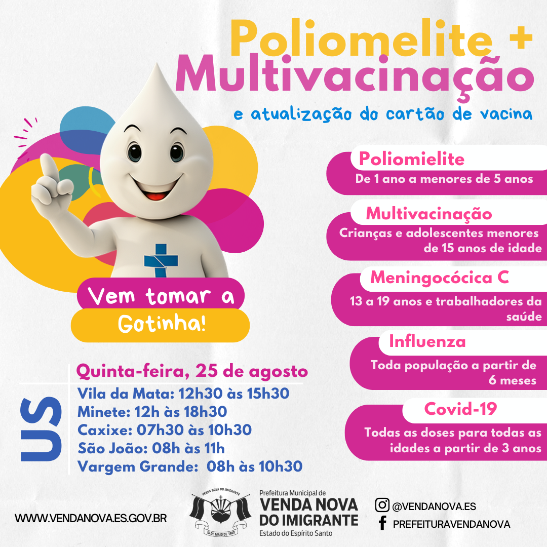 Tá na hora de tomar a gotinha! A Prefeitura de Venda Nova do Imigrante, através da Secretaria Municipal de Saúde, está focada na imunização dos munícipes. O Município está participando da campanha nacional de vacinação contra a poliomielite e a campanha nacional de multivacinação para atualização da caderneta de vacinação da criança e do adolescente. A campanha vai até o dia 09 de setembro de 2022. Se sua criança ou adolescente está com dose de vacina atrasada, ou ainda não tomou a gotinha, procure a sala de vacina de sua Unidade de Saúde de referência.