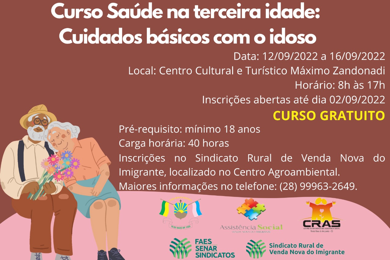 O Serviço Nacional de Aprendizagem Rural (Senar), em parceria com o sindicato rural com apoio da Prefeitura de Venda Nova do Imigrante realizará no dia 12 ao dia 16 de setembro, de 08h às 17h o curso gratuito Saúde na Terceira Idade: Cuidados Básicos com o Idoso. As inscrições são gratuitas e foram prorrogadas até o dia 02 de setembro.