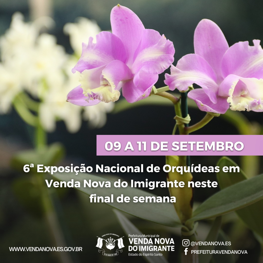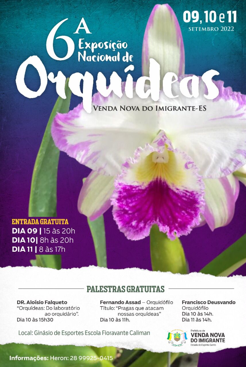 Programação especial em Venda Nova do Imigrante para contemplar a beleza, perfume, forma e tamanho das orquídeas da região capixaba e proximidades. De 09 a 11 de setembro acontece a 6ª Exposição Nacional de Orquídeas, que será realizada no Ginásio de Esportes da EEEFM “Fioravante Caliman” com entrada gratuita. O evento inclui palestras, mostra, venda e premiações de exemplares raros da planta.