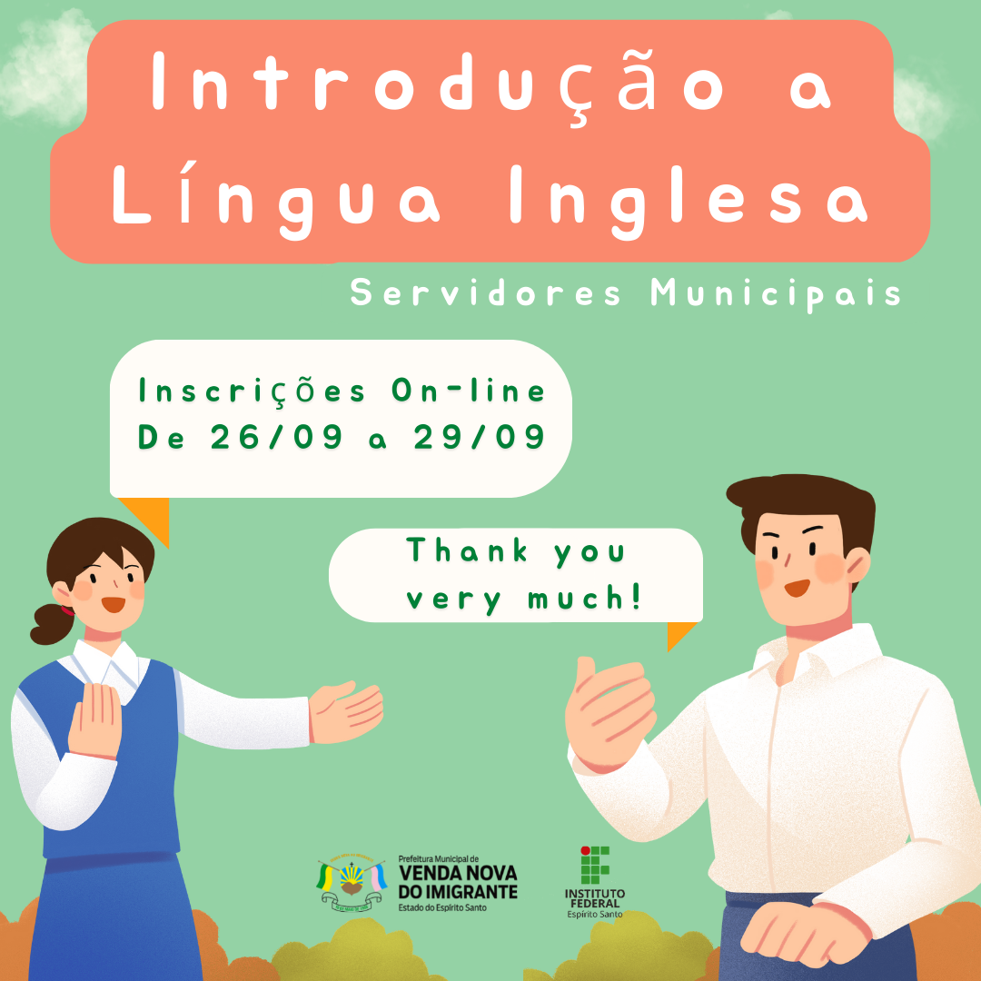 O Instituto Federal do Espírito Santo (IFES) – Campus Venda Nova do Imigrante, em parceria com a Prefeitura de Venda Nova do Imigrante, através da Secretaria Municipal de Educação, irá promover o curso Introdução à Língua Inglesa, destinado à servidores da Prefeitura de Venda Nova.  O curso que terá como objetivo, oportunizar a aprendizagem do idioma a servidores municipais,