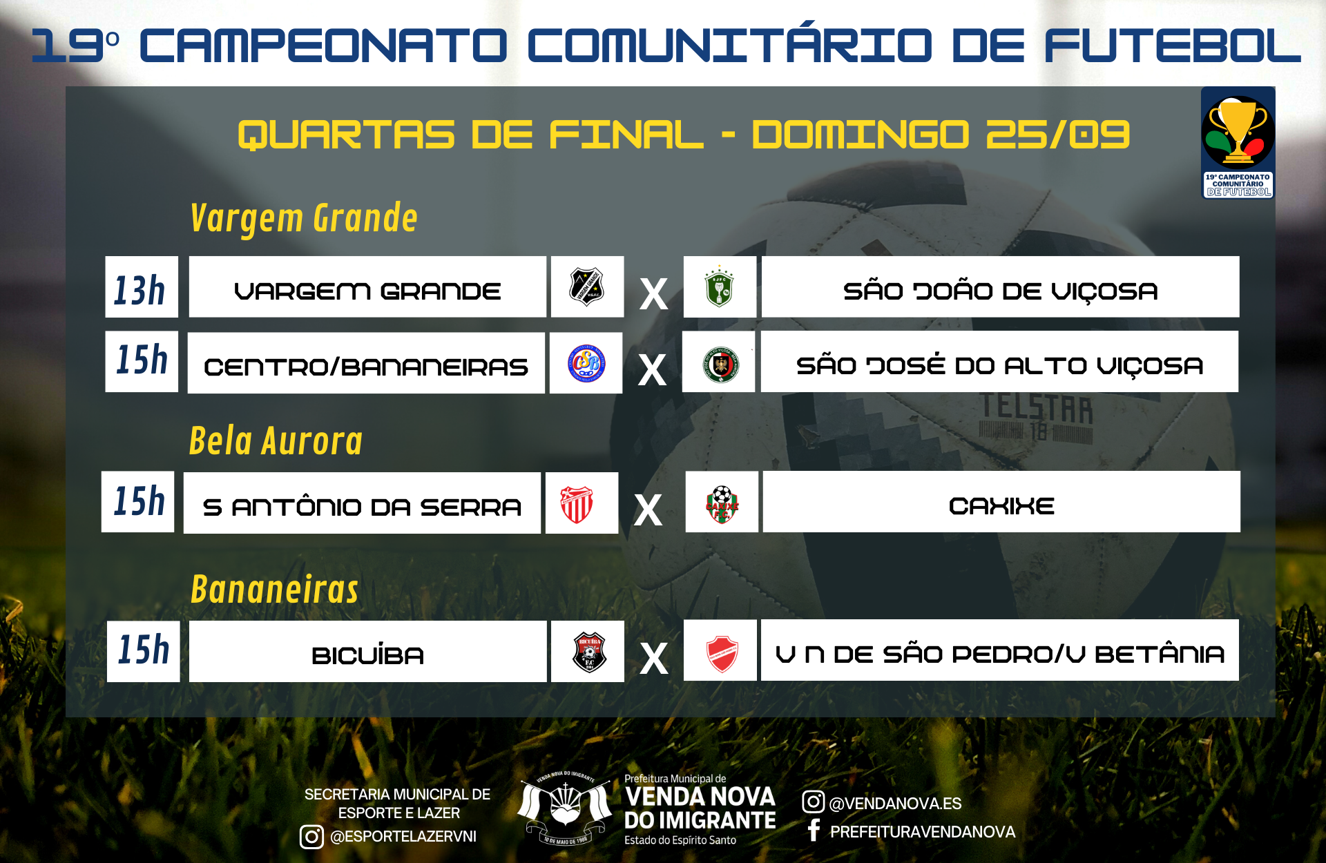Pelo grupo “A” se classificaram paras as quartas de final os times de; Santo Antônio da Serra, Bicuíba, Vargem Grande e a equipe do Centro/Bananeiras. Já no grupo “B”, avançaram; São Jose do Alto Viçosa, Caxixe, São João de Viçosa e Vila Nova/Betânia.