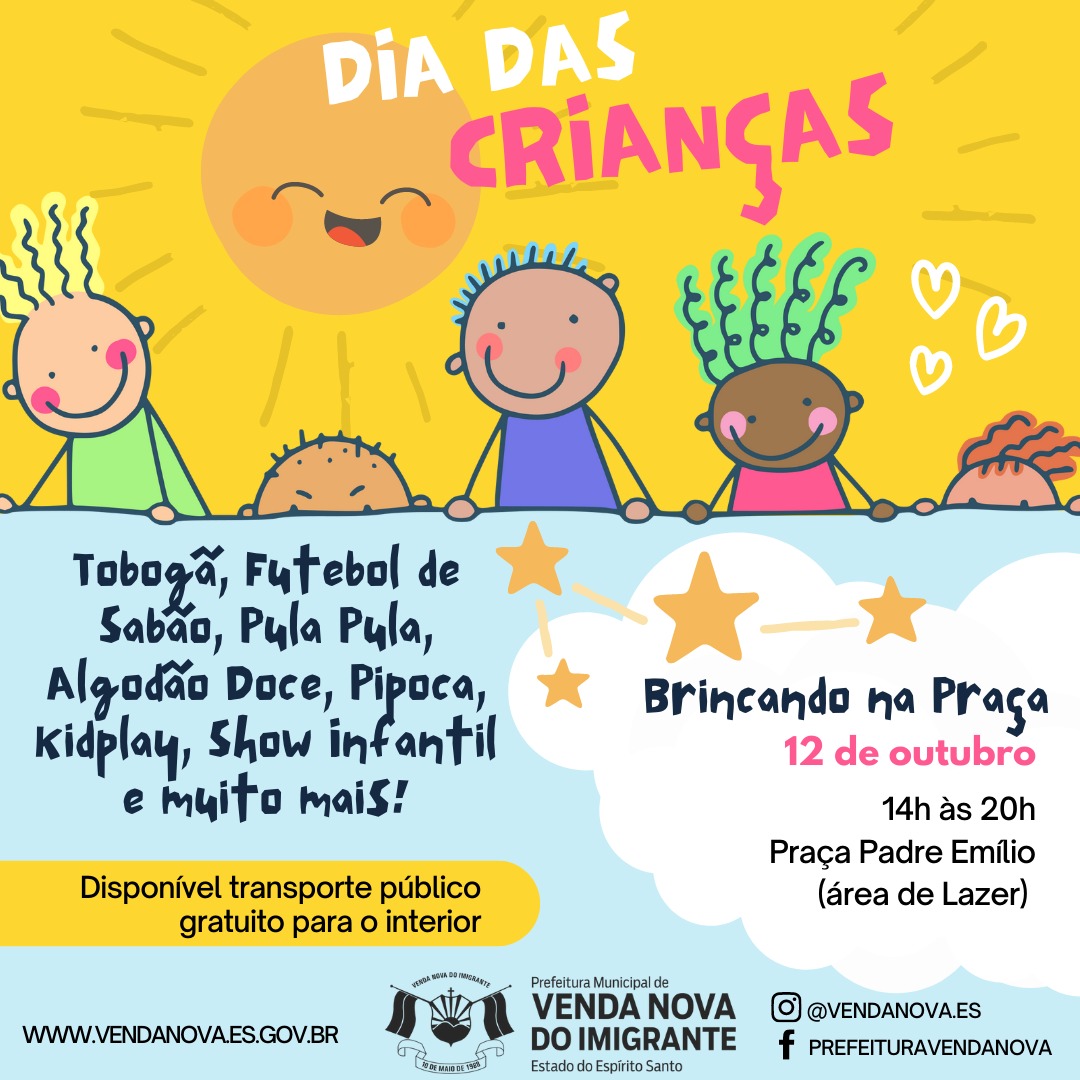 A Prefeitura de Venda Nova do Imigrante, através da Secretaria Municipal de Turismo, Cultura e Artesanato, em parceria com a Secretaria de Esporte e Lazer, realizará no próximo dia 12 de outubro, o “Brincando na Praça”, evento em comemoração do Dia das Crianças. O evento ocorrerá na Praça Padre Emílio (área de lazer), de 14h às 20 horas. A criançada vai poder se divertir com brinquedos como tobogã, kidplay, futebol de sabão, pula pula e se deliciar com algodão doce e pipoca. A entrada é gratuita.