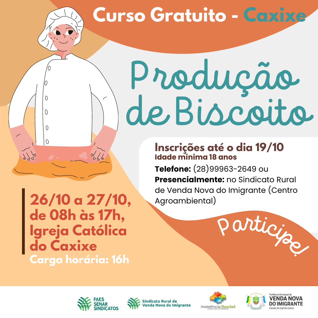 Mais uma oportunidade de qualificação gratuita em Venda Nova do Imigrante. Os munícipes que residem na comunidade do Caxixe terão uma excelente oportunidade de se qualificarem para o mercado de trabalho. Estão abertas as inscrições para o curso “Produção de Biscoitos”, que vai ser realizado na Igreja Católica do Caxixe, nos dias 26 e 27 deste mês (outubro), de 08h às 17h. A carga horária será de 16h no total.