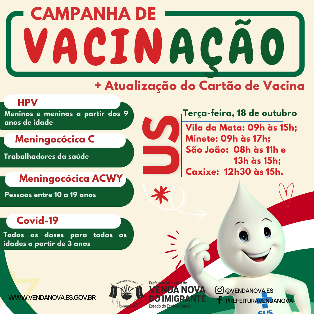 A saúde dos munícipes em primeiro lugar! A Prefeitura de Venda Nova do Imigrante, através da secretaria municipal de Saúde, realizará nesta terça-feira (18), campanha de vacinação nas unidades saúde do Município.