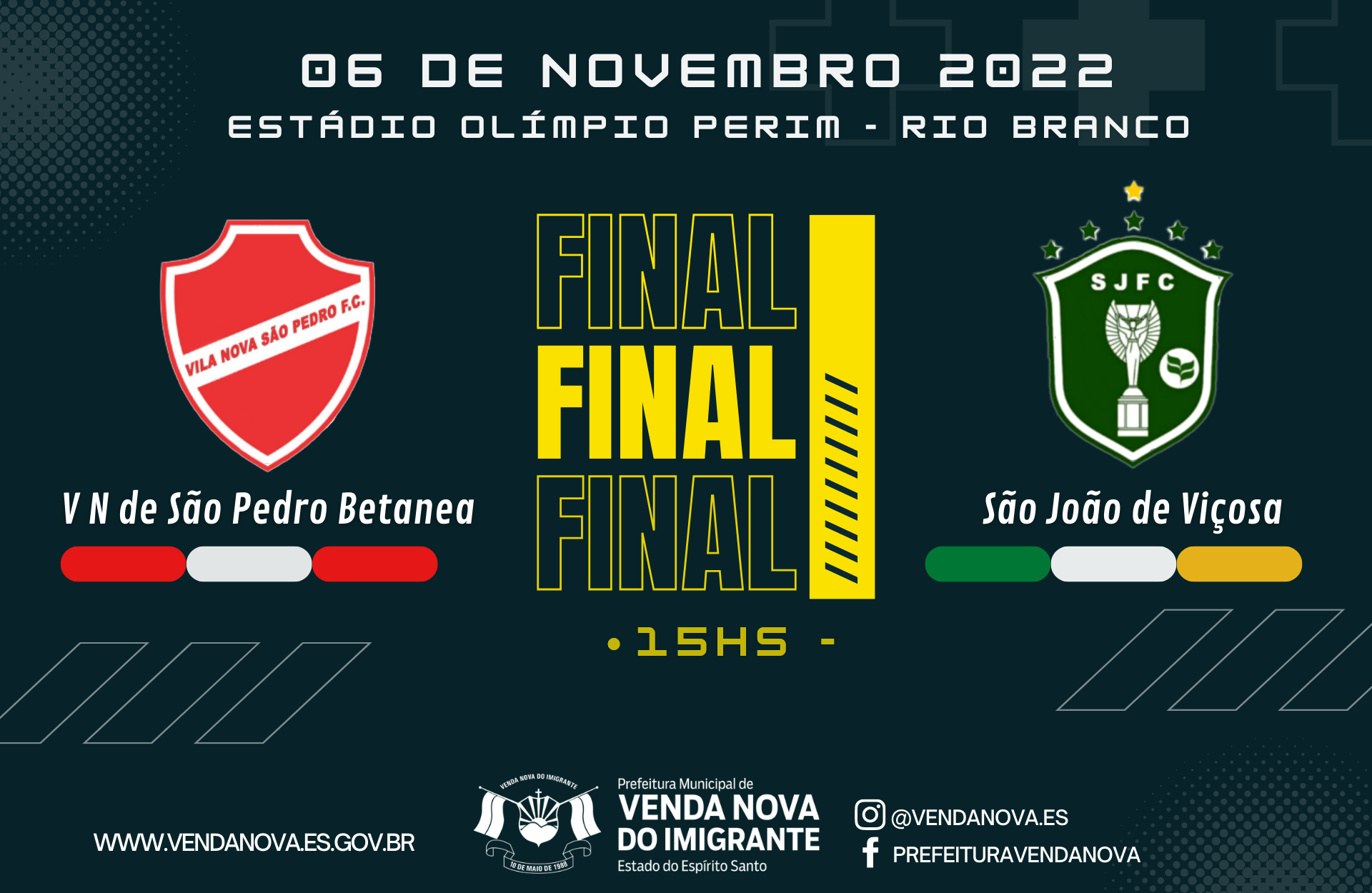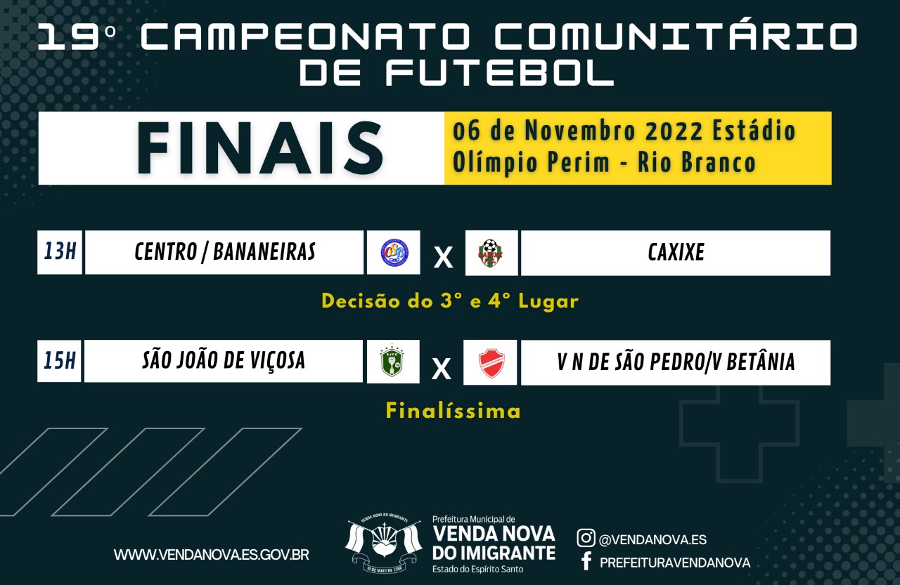 Futebol de qualidade em Venda Nova do Imigrante. Acontecerá neste domingo (06), a partir das 13h no Estádio Olímpio Perim – Rio Branco, a final do 19º Campeonato Comunitário de Futebol de Venda Nova do Imigrante. Confira abaixo os horários dos jogos.