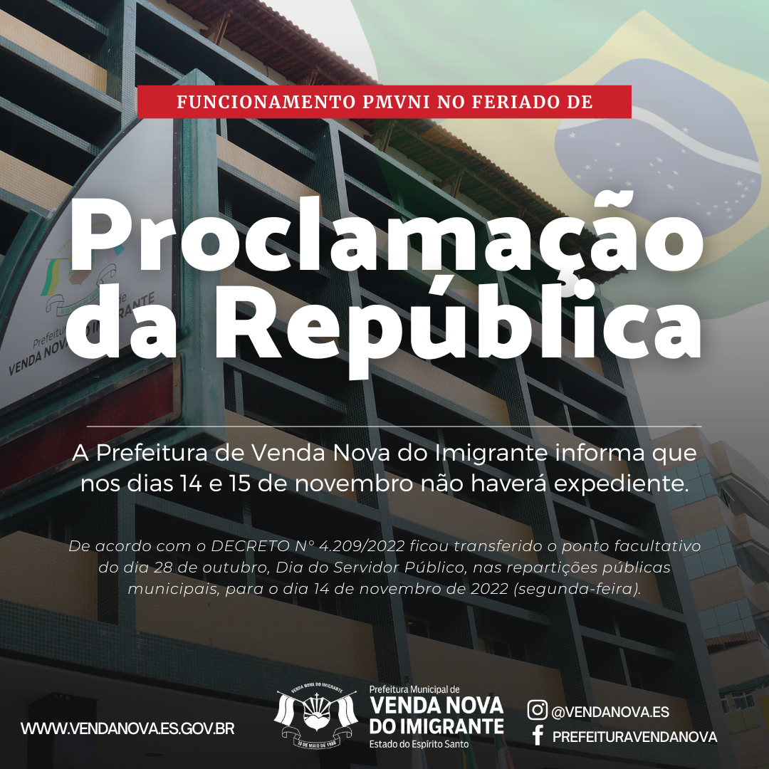 A Prefeitura de Venda Nova do Imigrante informa que nos dias 14 e 15 de novembro não haverá expediente. De acordo com o DECRETO N° 4.209/2022 ficou transferido o ponto facultativo do dia 28 de outubro, Dia do Servidor Público, nas repartições públicas municipais, para o dia 14 de novembro de 2022 (segunda-feira).
