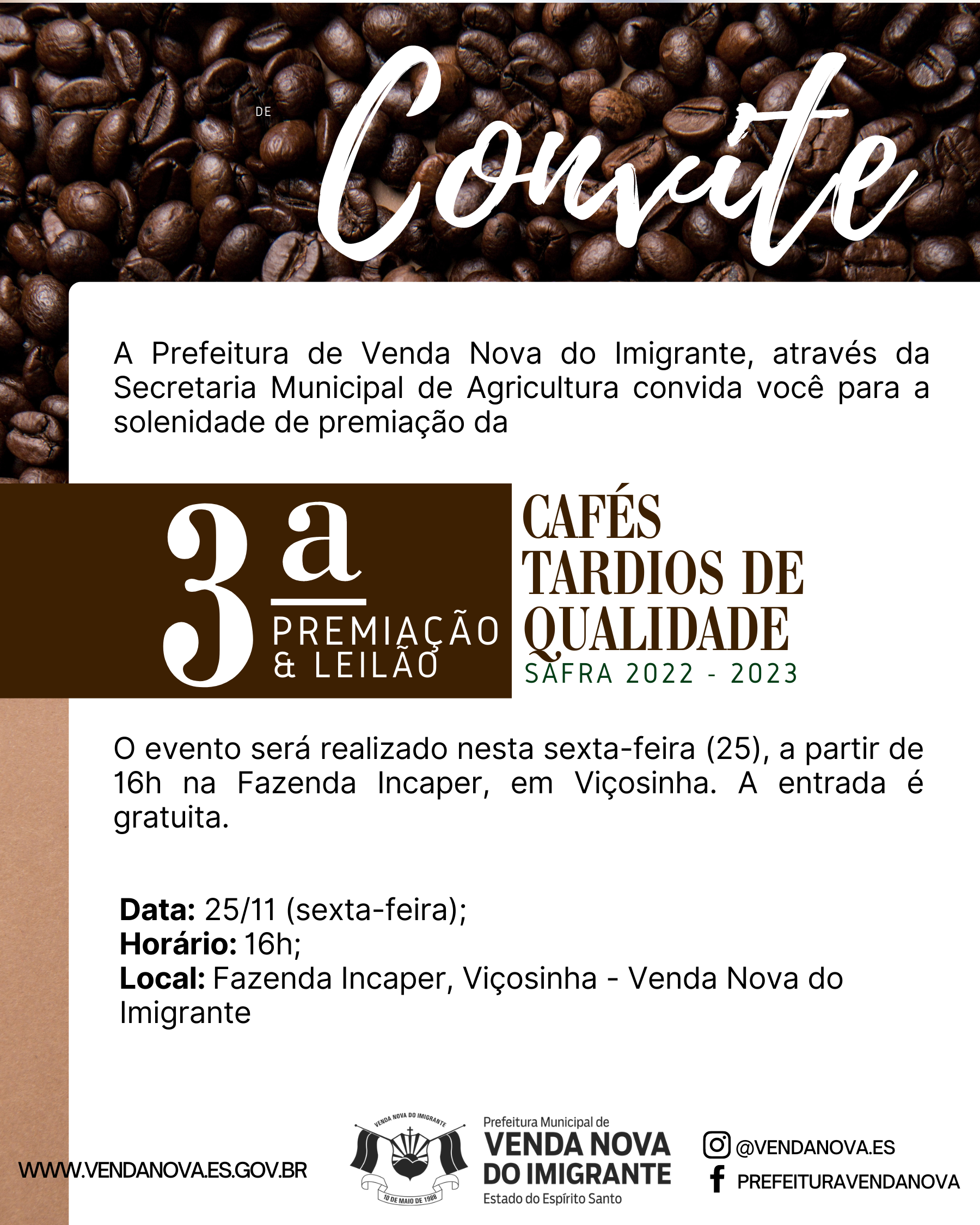 A Prefeitura de Venda Nova do Imigrante, através da Secretaria Municipal de Agricultura convida você para a solenidade de premiação da 3ª Premiação e Leilão de Cafés Tardios Especiais Safra 2022-2023.
