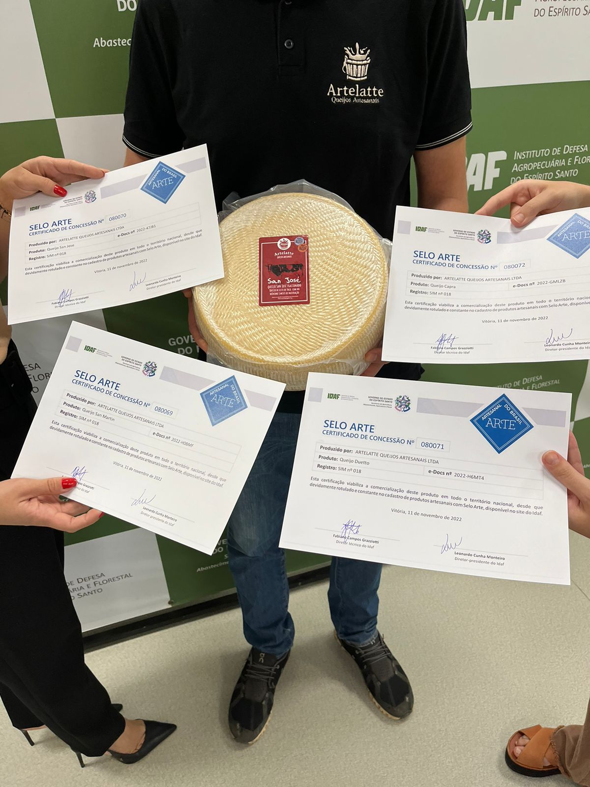 De acordo com Danielle Camatta, colaboradora da Artelatte Queijos Artesanais, “a solicitação e a aprovação do selo levou cerca de cinco meses, mas o trabalho é muito anterior, com registro e acompanhamento de anos com o SIM. Nós garantimos qualidade e cuidado dentro e fora do laticínio, uma vez que para a obtenção do Selo Arte, a boa prática no curral, com toda a questão sanitária, de higiene e bem-estar animal, também deve ser seguida ao pé da letra.” Danielle ainda destaca a importância do recebimento do selo. “Com o Selo Arte poderemos chegar a mais pessoas por todo o Brasil! Serão mais pessoas consumindo o autêntico queijo capixaba, feito nas montanhas com muito orgulho, paixão e artesanalidade.”