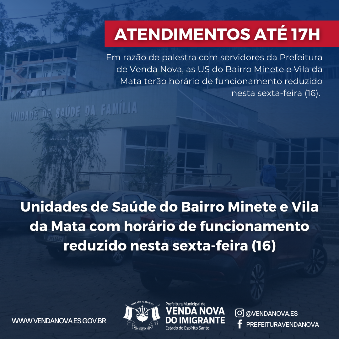 Atenção munícipe! Em razão de palestra com servidores da Prefeitura de Venda Nova, as Unidades de Saúde do Bairro Minete e Vila da Mata terão horário de funcionamento reduzido nesta sexta-feira (16). Os atendimentos serão realizados até às 17h.