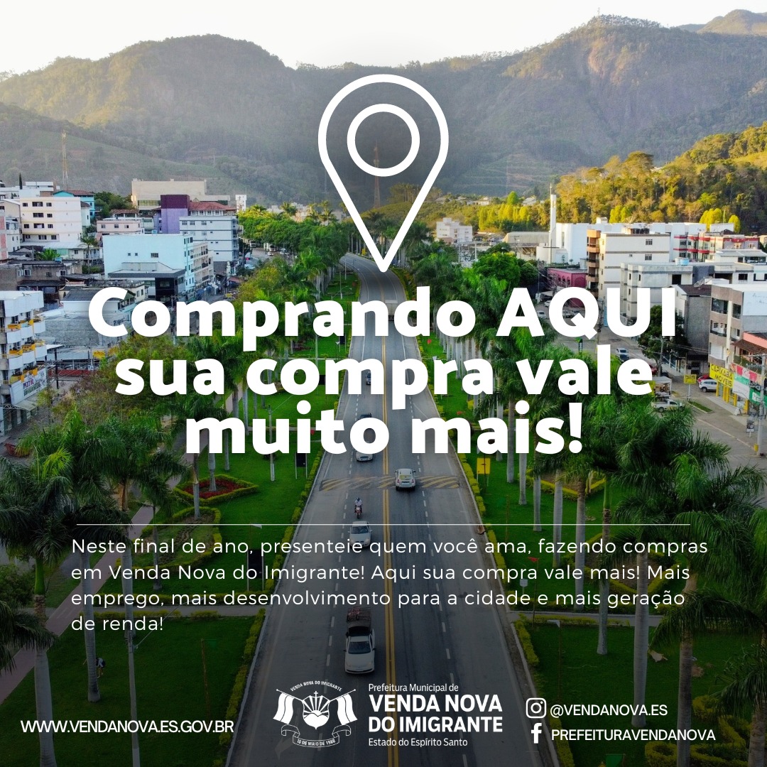 Munícipe, apoie o comércio local! Neste final de ano, presenteie quem você ama, fazendo compras em Venda Nova do Imigrante! Aqui sua compra vale mais! Mais emprego, mais desenvolvimento para a cidade e mais geração de renda!