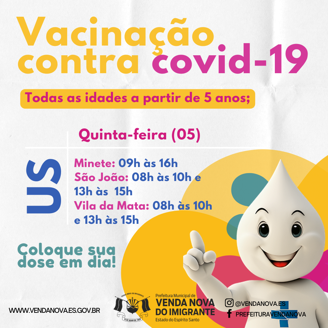A Prefeitura de Venda Nova do Imigrante, através da Secretaria Municipal de Saúde, continua a imunização dos munícipes contra a Covid-19. Nesta quinta-feira (05), a campanha de vacinação abrangerá todas as idades superiores a 5 anos. Coloque sua dose em dia! Confira abaixo os horários e locais de vacinação: