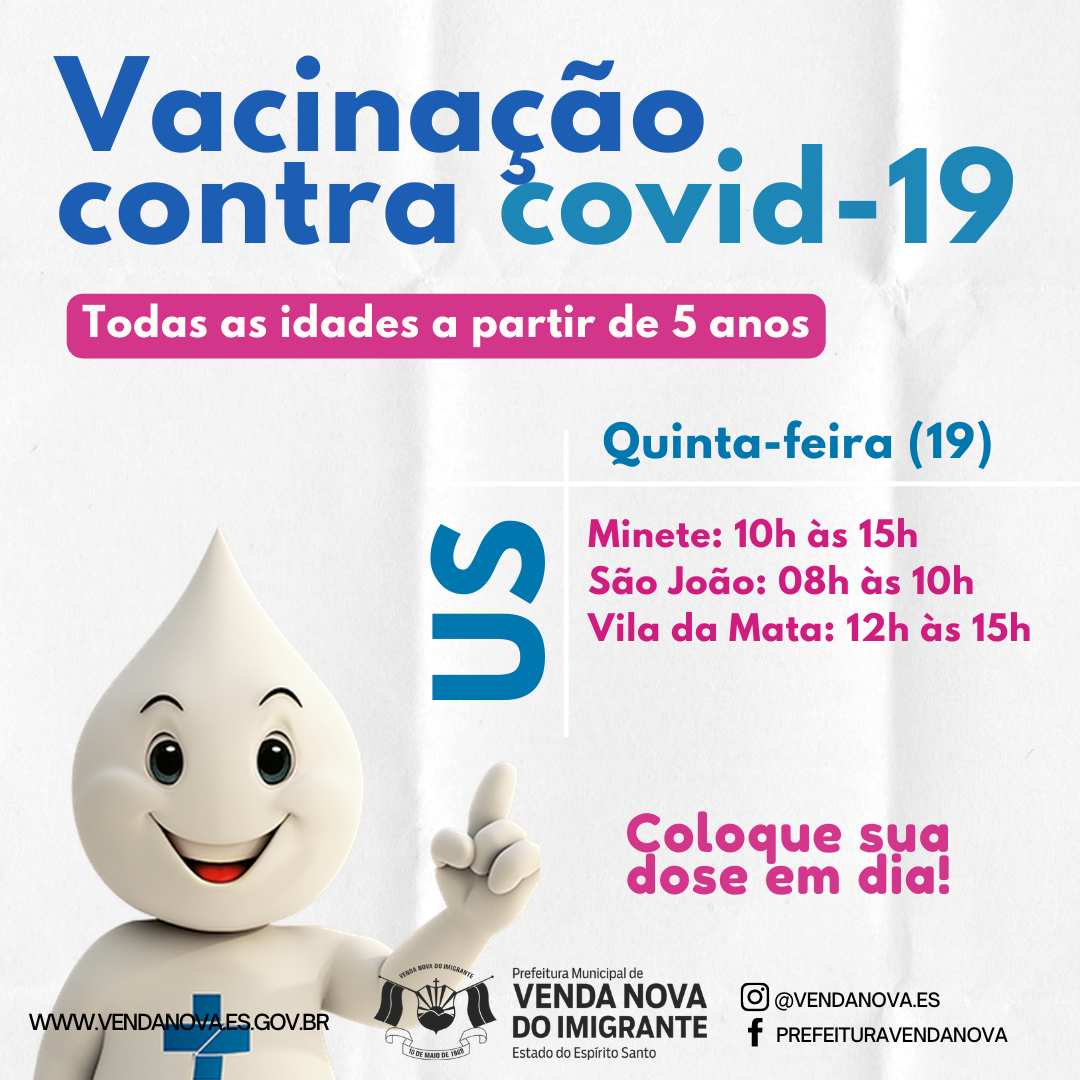 A Prefeitura de Venda Nova do Imigrante, através da Secretaria Municipal de Saúde, continua a imunização dos munícipes contra a Covid-19. Nesta quinta-feira (19), a campanha de vacinação abrangerá todas as idades superiores a 5 anos. Coloque sua dose em dia! Confira abaixo os horários e locais de vacinação: