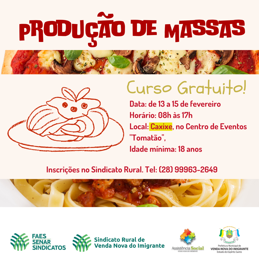 A Prefeitura de Venda Nova do Imigrante em parceira com o Sindicato Rural de Venda Nova, está com inscrições abertas para o curso “Produção de Massas”. A qualificação gratuita tem como requisito idade mínima de 18 anos e será realizada no Centro de Eventos Tomatão, no Caxixe, nos dias 13, 14 e 15 de fevereiro de 08h às 17h.
